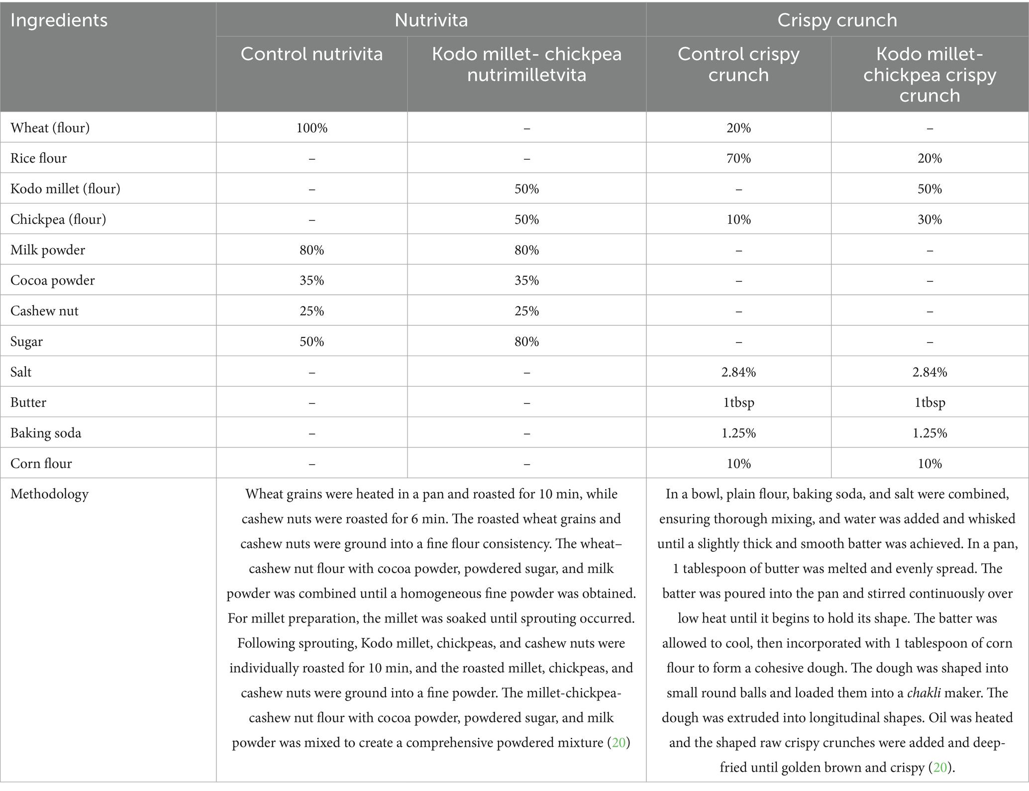 Methods: Food products, such as “crispy crunch” and “nutrimilletvita,” were formulated using Kodo millet (IPS 178), wheat (PBW 826), rice (PR 131), and chickpea in different proportions. For “crispy crunch,” the ingredients were supplemented in the ratio of 50:30:20 percent, while “nutrimilletvita” was prepared with 50 percent supplementation of each of Kodo millet and chickpea. The developed food products were tested for their acceptability and nutritional composition against the traditional cereal.