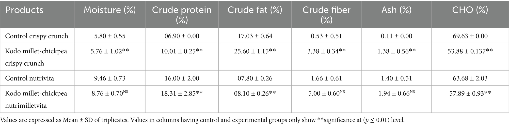 Consumer acceptability evaluation scale is a measure of using the Likert scale to determine the liking of consumers for food items in terms of their taste, texture, appearance, flavor, etc. In the current study, the developed products obtained scores comparable with their control counterparts, depicting the consumer’s acceptability toward this product. The low score of Kodo millet–chickpea can be due to the dark green color that the product attained after frying, which is clear from the scores for color (3.22), appearance (2.70), texture (3.70), taste (4.00), and flavor (2.70). Moreover, the product observed had higher fat and was commented as oily due to more fat absorption by the millet as it has higher fiber content (7.40 ± 0.39 g/100 g). Moreover, Kodo millet has high amylose content, which forms a porous structure and swells when cooked, allowing more fat to be absorbed. On the contrary, the developed nutrimilletvita obtained a significantly higher overall acceptability score of 4.70 as compared with the developed crispy crunch as well as the control nutrivita. This could be attributed to the addition of milk powder and cocoa powder along with millet powder, making an acceptable combination for consumption, particularly by school-going children. The consumers showed great satisfaction and liking for the developed Kodo millet–chickpea–based products, which is clear from the overall acceptability score. Evidence suggested that pearl millet-based dalia received higher acceptability scores compared with their control counterpart (45). Contrary to the present study, a study reported the reception of low organoleptic scores (3.1 to 3.7) of finger millet-based food products (46). The addition of chickpeas to the products in the current study might have improved the taste and overall consumer acceptability. The combination not only balances the flavor profile but also improves texture and nutritional quality, making the products more appealing and beneficial. Likewise, the addition of pulses was reported to improve the unique aroma and texture of millet-based foods (47, 48).