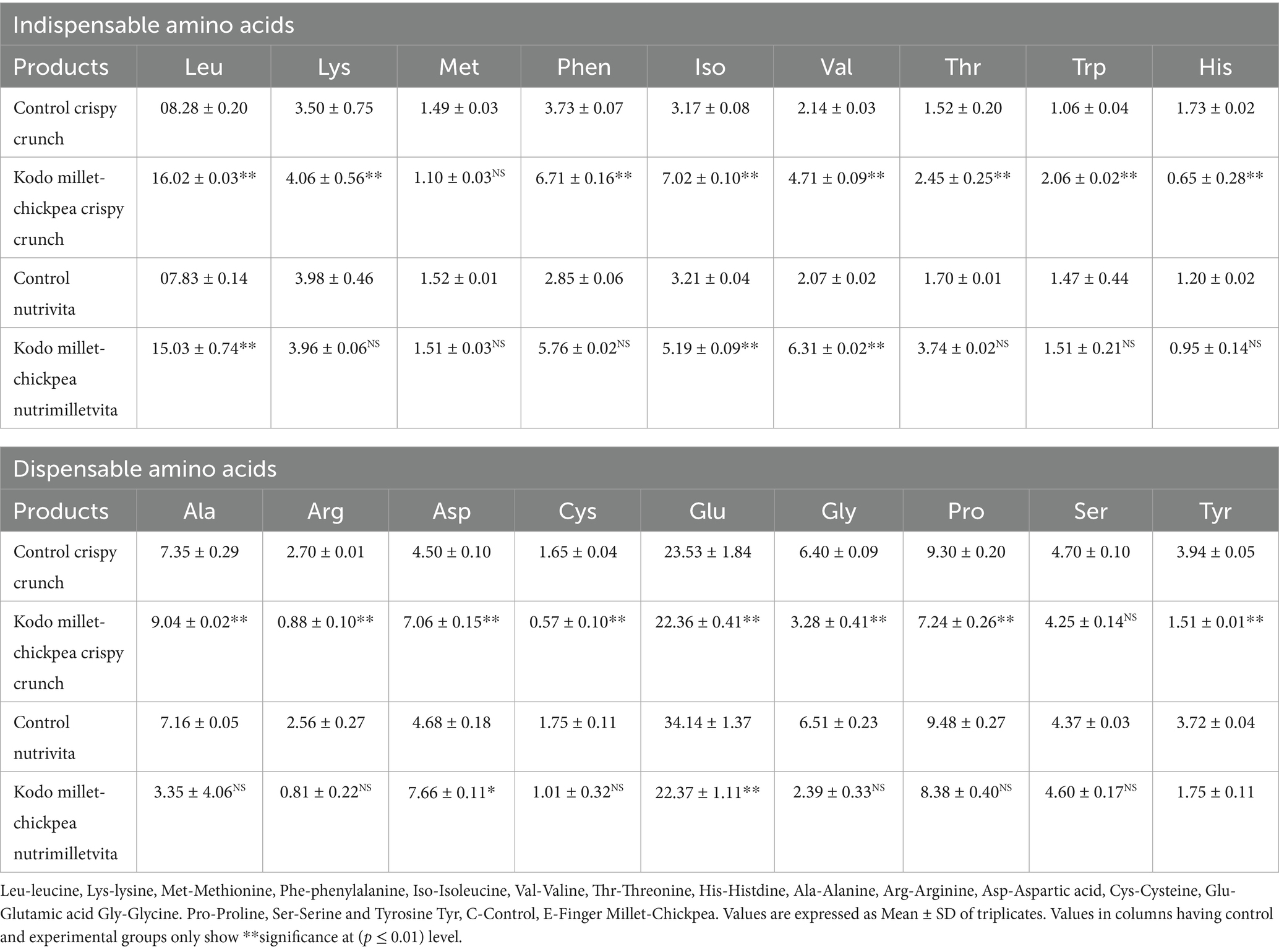 Table 3. Amino acid composition of Kodo millet–chickpea products (g/100 g, dry weight basis).