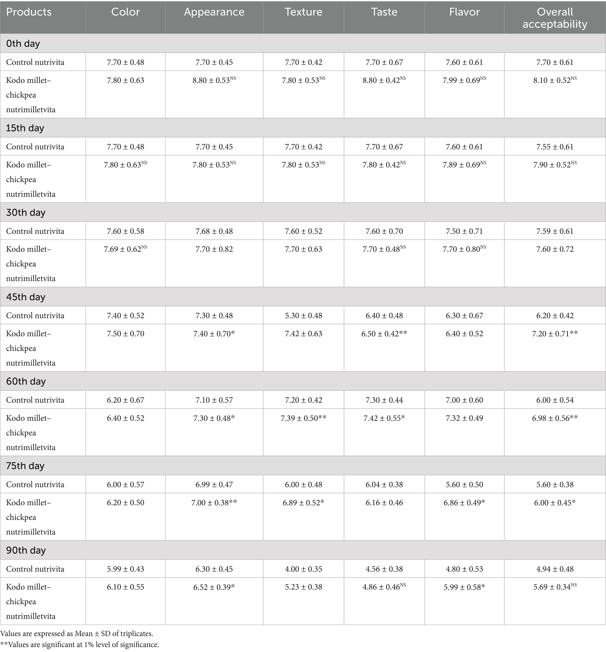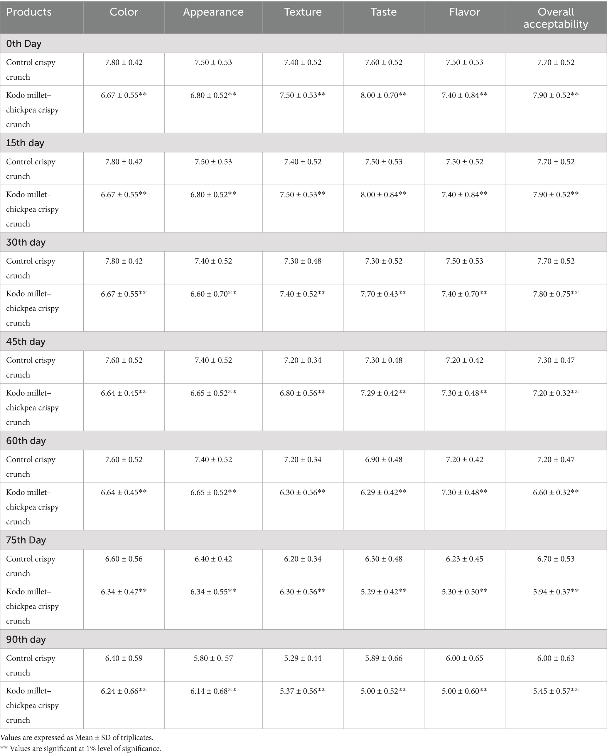 The food products developed from a combination of Kodo millet and chickpea, were sealed in low-density polyethylene pouches (thickness-51 microns) and stored at a constant room temperature (37 °C) in cool and dry conditions, which were evaluated every 15 days over 3 months through sensory assessments conducted by a semi-trained panel using a 9-point Hedonic scale (Tables 4, 5). The sensory scores of the developed products, Crispy Crunch and Nutrimilletvita, were 7.90 ± 0.52 and 8.10 ± 0.52, respectively, on the 0th day. These scores gradually declined to 5.45 ± 0.57 and 5.69 ± 0.34 by the 90th day, showing a significant (p ≤ 0.01) decrease over the 3-month storage period.