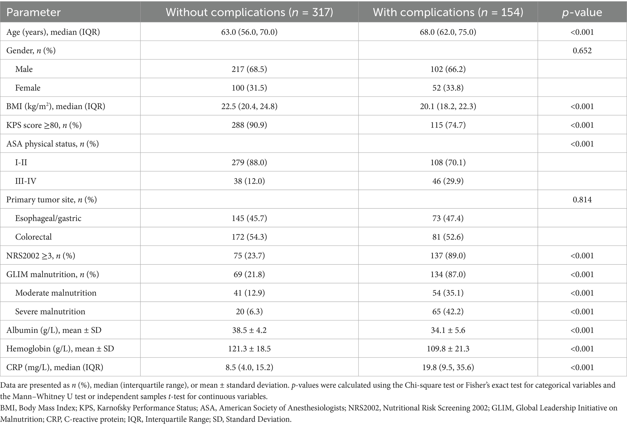Patients were divided into two groups based on the occurrence of postoperative complications: a complication-free group (n = 317, 67.30%) and a complication group (n = 154, 32.70%). As shown in Table 1, significant differences were observed between the groups in terms of age, BMI, prevalence of comorbidities, ASA classification, KPS score, NRS2002-defined nutritional risk, GLIM-defined malnutrition, and severity of malnutrition (all p < 0.05). Specifically, patients in the complication group were older, had lower BMI, higher ASA scores, lower KPS scores, and were more likely to be at nutritional risk or have malnutrition. No significant intergroup differences were noted for gender, education level, smoking history, alcohol history, primary tumor site, surgical method, tumor differentiation, TNM stage, or receipt of perioperative nutritional support (all p > 0.05).