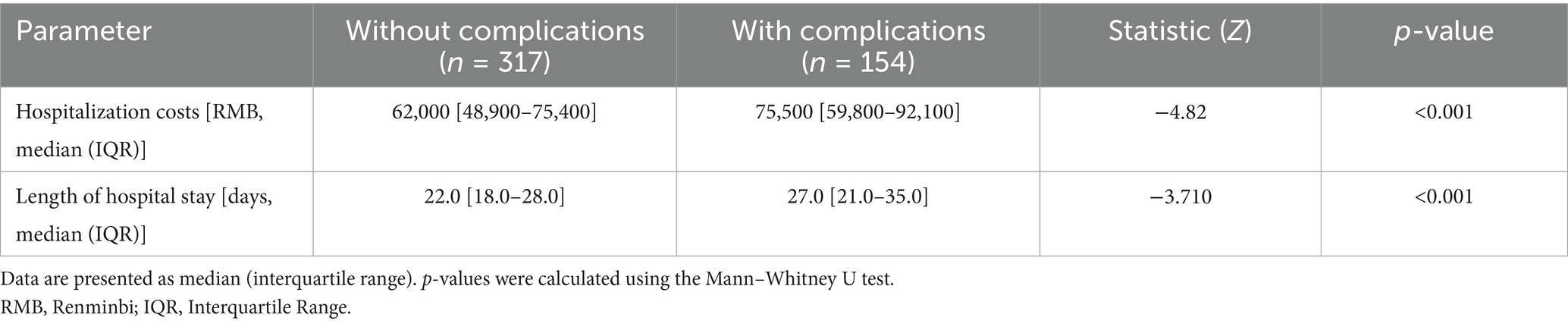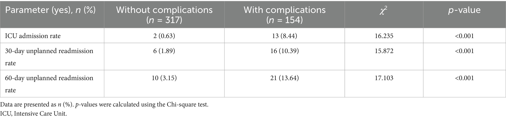 Patients who experienced postoperative complications had substantially worse clinical and economic outcomes compared to those without complications. A detailed comparison is provided in Tables 2, 3. In summary, the complication group incurred significantly higher median hospitalization costs (RMB 75,500 vs. RMB 62,000; p < 0.001) and had a significantly longer median length of hospital stay (27.0 days vs. 22.0 days; p < 0.001). Furthermore, rates of ICU admission (8.44% vs. 0.63%; p < 0.001), 30-day unplanned readmission (10.39% vs. 1.89%; p < 0.001), and 60-day unplanned readmission (13.64% vs. 3.15%; p < 0.001) were all significantly higher in the complication group.
