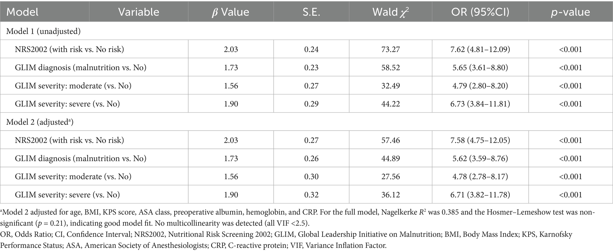 Univariable logistic regression analysis indicated that NRS2002-defined nutritional risk, GLIM-defined malnutrition, and GLIM malnutrition severity grades were significantly associated with an increased risk of postoperative complications. After adjusting for potential confounding factors (age, BMI, KPS score, ASA class, preoperative albumin, hemoglobin, and CRP) in the multivariable model, these associations remained statistically significant (Table 4).