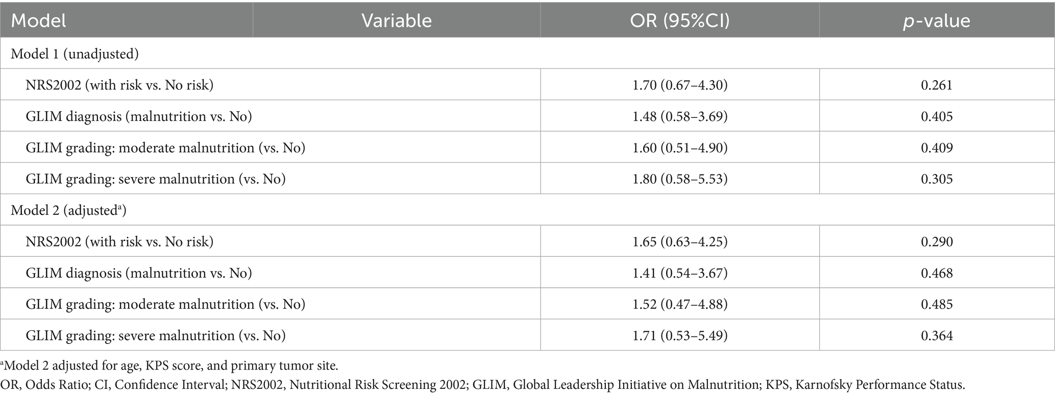 Logistic regression analyses were conducted to evaluate the association between nutritional status (by NRS2002 and GLIM) and unplanned 30-day and 60-day readmissions. In both unadjusted and adjusted models (adjusted for age, KPS score, and primary tumor site), neither NRS2002-defined nutritional risk, GLIM-defined malnutrition, nor GLIM severity grading showed a statistically significant association with the risk of 30-day unplanned readmissions (Table 5) or 60-day unplanned readmissions (Table 6).