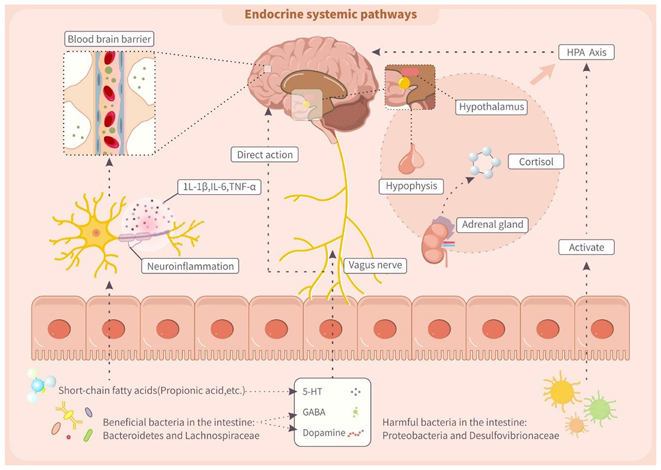 Figure 3 (MGBA) suggests that TFAs can alter gut microbiota, thereby impacting neuroendocrine signaling in the hypothalamic-pituitary-adrenal (HPA) axis and central nervous system. Gut microbiota, a crucial participant in MGBA signaling, directly regulates the metabolism of neurotransmitters, including dopamine, 5-HT, GABA, and glutamate (143). Dopamine and 5-hydroxytryptamine are crucial for the executive function of the prefrontal cortex. Notably, dopamine affects cognitive modulation, reward processing, and motivation. Intestinal flora like Bacteroides and Lactobacillus contain dopamine synthesizing and catabolic enzymes, and can modulate their bioavailability (144). Furthermore, the intestinal flora regulates 5-HT synthesis and metabolism, which in turn influences intestinal motility and the emotional and cognitive functions of the central nervous system (145). This process may be modulated by its metabolites, SCFAs, that have effects on colonic enterochromaffin cells and modulate colonic 5-HT synthesis (146). Additionally, Bacteroides and Lactobacillus produce GABA, which influences intestinal integrity and vagal signaling, and when intestinal flora dysbiosis causes abnormalities in GABA synthesis or function, the imbalance of this pathway can potentially lead to neurological disorders (147, 148). Notably, TFAs can alter gut microbiota composition, potentially impairing SCFA production and disrupting HPA axis regulation (149). In animal studies, for example, gut dysbiosis was linked to reduced hypothalamic glucocorticoid levels and increased CRH synthesis, leading to HPA axis hyperactivation and elevated cortisol (150). This finding suggested gut microbes influence HPA axis activity. Clinically, children with ADHD exhibited lower HPA axis activity and cortisol levels, possibly due to gut microbiota dysregulation (151). Therefore, TFAs might activate endocrine pathways and affect HPA axis function by modifying gut microbiota.