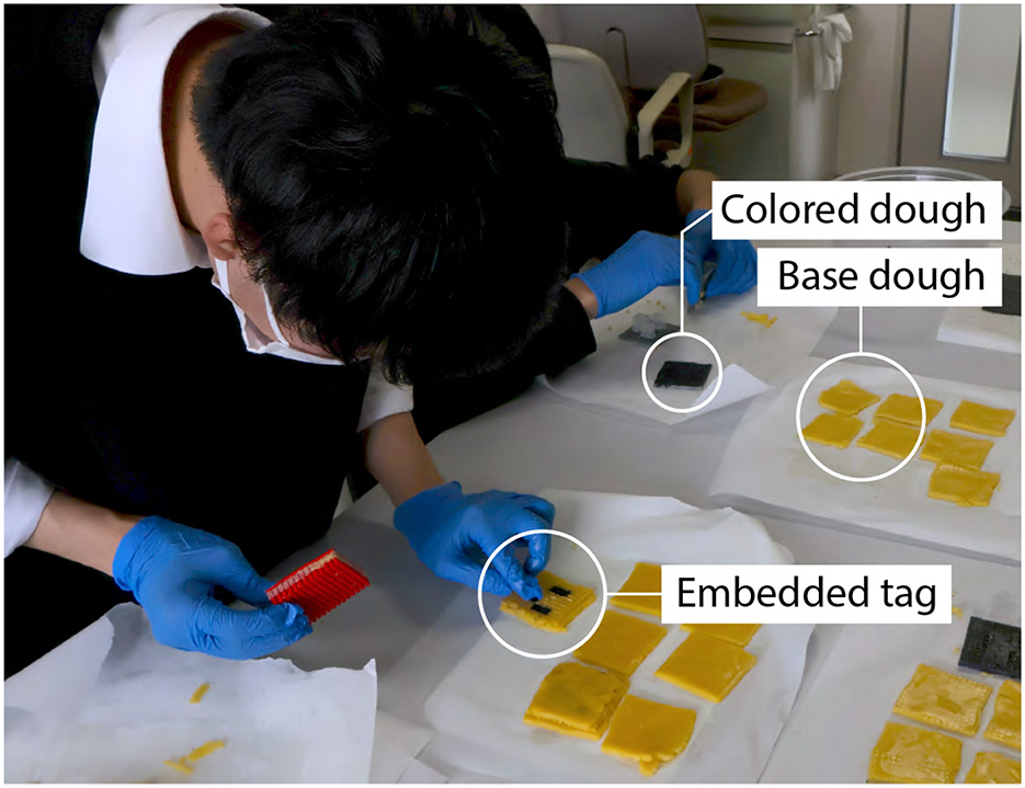 As mentioned in Section 2, we use cookie dough as the target food for embedding a tag. The sample tag is a binary tag consisting of 13 × 13 modules (i.e., a micro QR code), which can represent about six alphabetic characters or ten numeric digits (9). The number of modules can be increased depending on the amount of data to be stored.