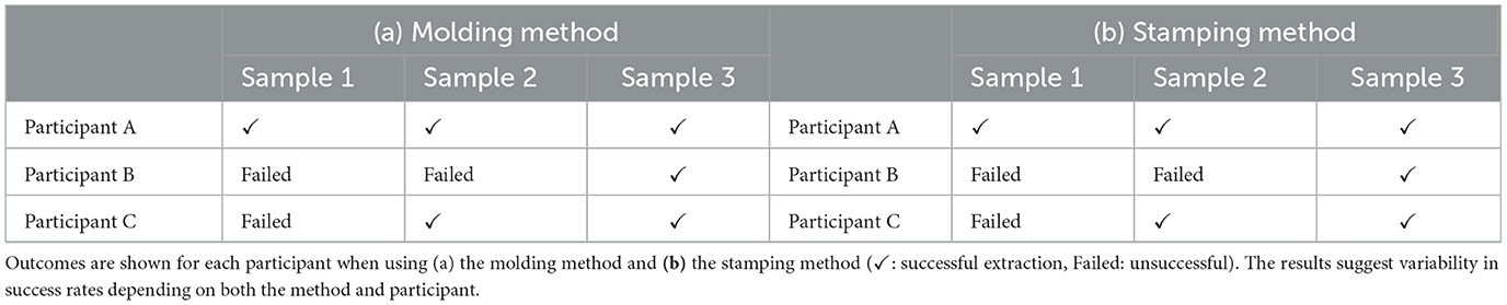 Figure 17 presents a captured scene from the workshop. Table 1 summarizes the extraction results. Overall, approximately 67% of the tags were successfully recognized using the image processing pipeline described in Section 2.5. Notably, all the samples produced by Participant A using both the stamping and molding methods were correctly recognized. An example of a successful sample is shown in Figure 16b, where the tag structure remained intact after baking.