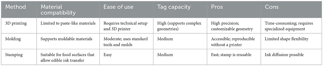 To summarize the distinctions among the three fabrication methods, we provide a comparative overview in Table 2. The table outlines key differences in terms of material compatibility, ease of use, tag capacity, advantages, and limitations. This comparison highlights the trade-offs between technical precision and accessibility, offering guidance for selecting an appropriate method based on the target cooking context and user expertise.