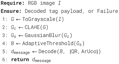 The image preprocessing and decoding steps are summarized in Algorithm 1. The captured image is converted to grayscale, processed with adaptive histogram equalization (CLAHE) to increase contrast, and smoothed with a Gaussian blur to reduce noise (Figure 5c). It is then binarized using the adaptive Gaussian threshold method to extract the tag shape (Figure 5d). QR codes are recognized using a standard QR library (e.g., QRQR, DENSO WAVE). In our example, we also use the ArUco library to recognize ArUco markers. Figures 5e, f show, respectively, the decoding process using the QR library and the decoded result using the ArUco library for a 3D position tracking application.