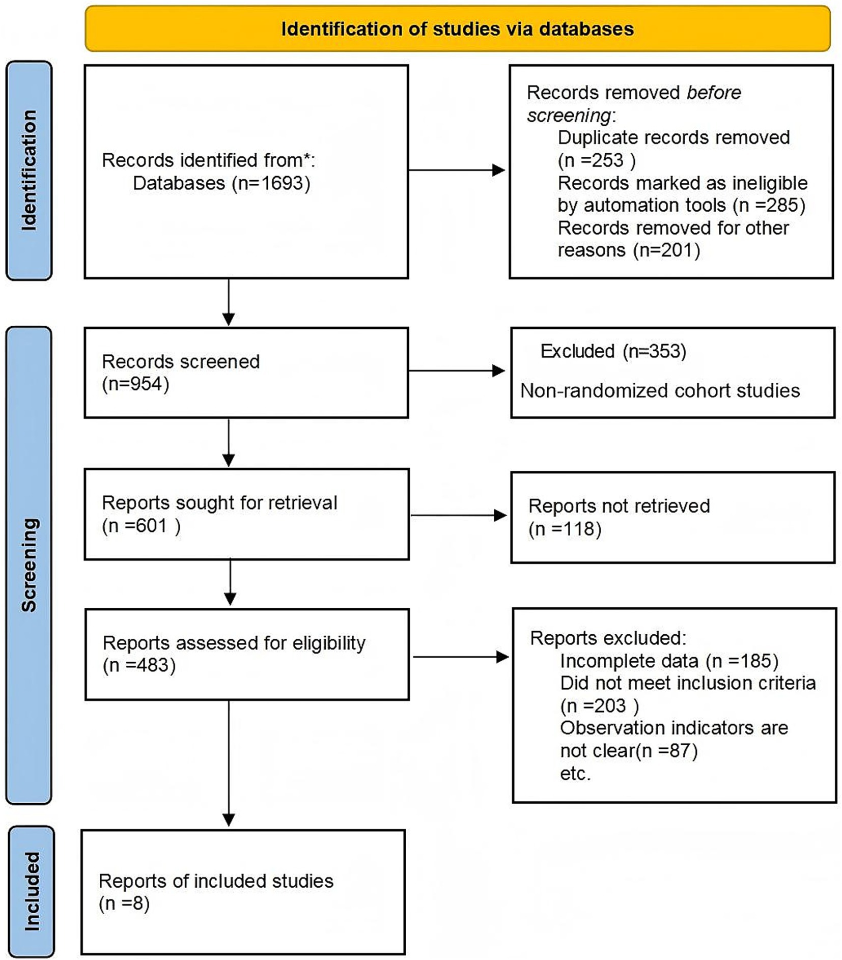 Flowchart showing the identification of studies via databases. Initial records from databases total one thousand six hundred ninety-three, with non-screening removals totaling seven hundred thirty-nine. Screening reviewed nine hundred fifty-four, resulting in three hundred fifty-three exclusions. Reports sought total six hundred one, with one hundred eighteen not retrieved. Of four hundred eighty-three assessed reports, three hundred seventy-five were excluded for incomplete data or unmet criteria. Eight studies were included.