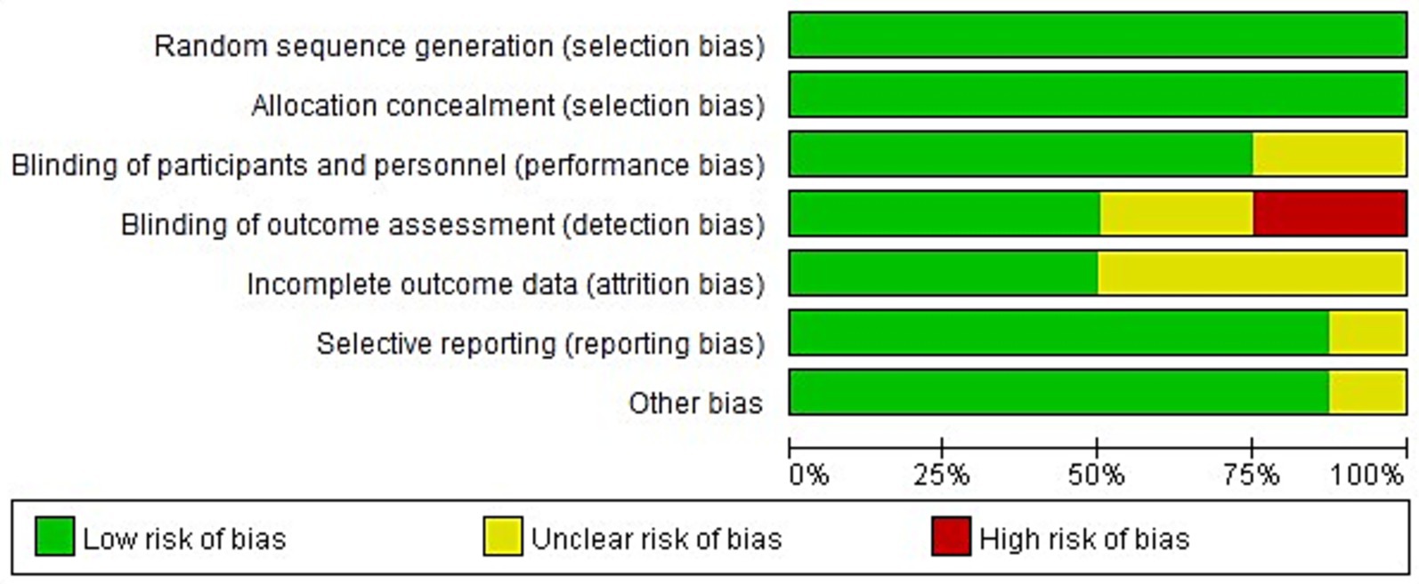 All eight of the RCTs that were included of this meta-analysis reported baseline patient information and gave thorough explanations of the intervention procedures and outcome measures. However, none of the studies explicitly reported the methods or extent of blinding, nor did they adequately describe the number of individuals lost to follow-up or the reasons for withdrawal. Figures 2, 3 show the risk of bias assessment for the included studies.