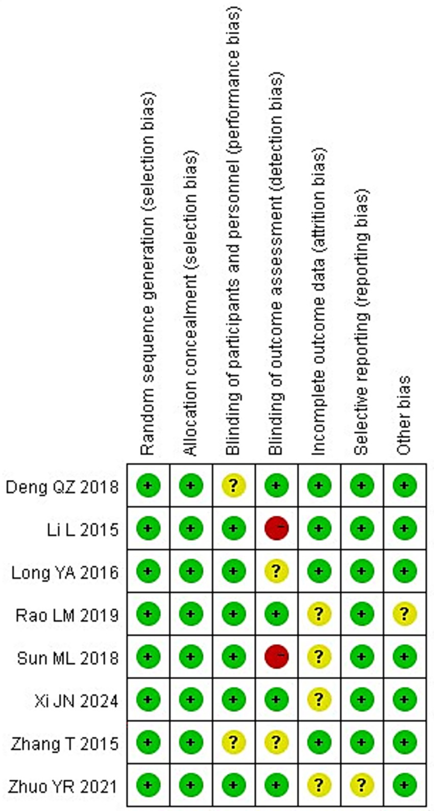 Quantitatively, six of the eight studies (75%) were judged as having a low risk of bias for random sequence generation and allocation concealment, while all studies were rated as having unclear or high risk for blinding of participants and outcome assessment. Specifically, 2 studies (25%) showed a high risk of performance bias due to unblinded interventions, and 3 studies (37.5%) had unclear detection bias. Incomplete outcome data were reported in only 3 studies (37.5%), and selective reporting was unclear in 2 (25%).