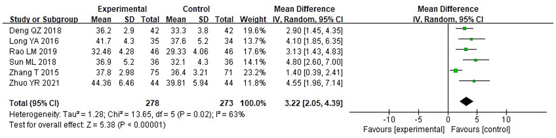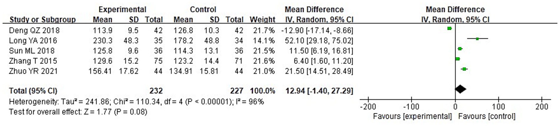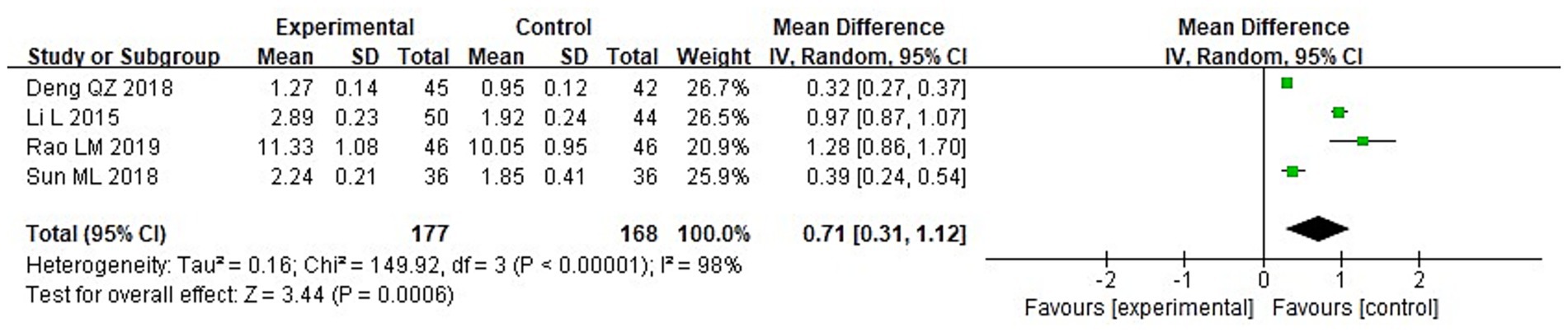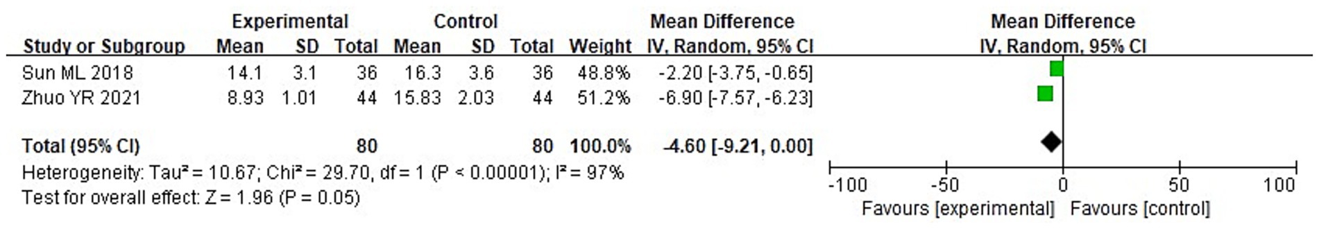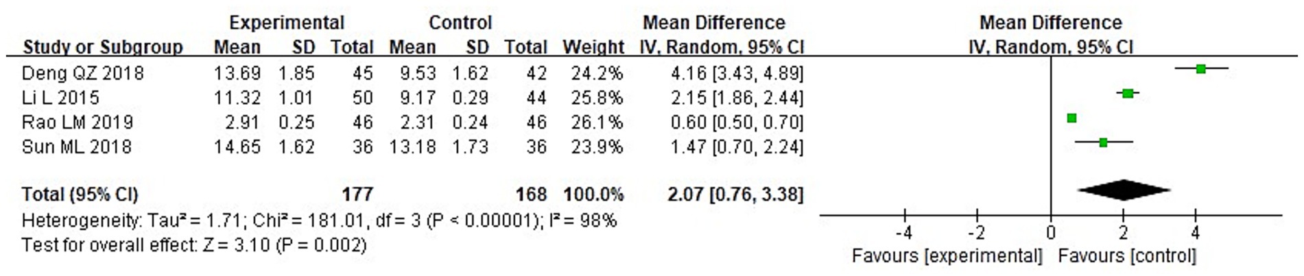 Among 8 studies, 2 studies reported the GCS scores of the two groups after treatment. It can be known from the findings of the heterogeneity test that: Chi2 = 2.29, df = 1, p = 0.13, I2 = 56%, indicating heterogeneity among the included research data. It can be known from the random effects model analysis (Figure 5) that the GCS score of the IG after treatment was higher than that of the control group (CG) (MD = 1.83, 95%CI: 1.11–2.56, p < 0.0001).