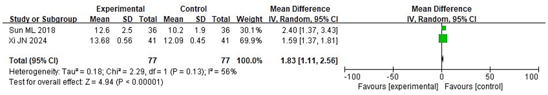 Forest plot showing two studies comparing experimental and control groups. Sun ML 2018 and Xi JN 2024 report mean differences of 2.40 and 1.59, respectively. The combined mean difference is 1.83 with a 95% confidence interval of 1.11 to 2.56. Heterogeneity is indicated with a Tau squared of 0.18 and an I squared of 56%. Overall effect test yields Z = 4.94, P < 0.00001.