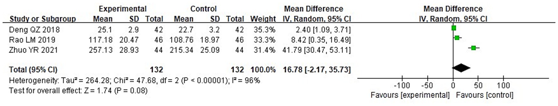 Forest plot illustrating the mean differences between experimental and control groups across three studies: Deng QZ 2018, Rao LM 2019, and Zhuo YR 2021. Each study's mean, standard deviation (SD), and sample size are listed, with weights ranging from 31.4% to 35.3%. The plot displays confidence intervals for each study and a diamond representing the overall effect size. The total mean difference is 16.78 with a 95% confidence interval of -2.17 to 35.73. Heterogeneity is high, with I² at 96%. The plot favors the experimental side.