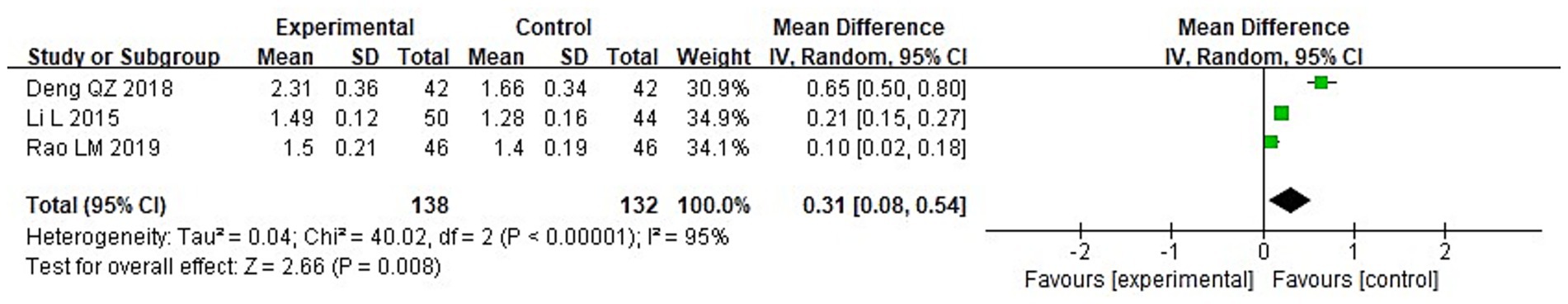 Forest plot showing the mean difference between experimental and control groups for three studies: Deng QZ 2018, Li L 2015, and Rao LM 2019. Each study lists mean, standard deviation, total, weight, and 95% confidence interval. Combined results show a total mean difference of 0.31 with a 95% confidence interval [0.08, 0.54]. Heterogeneity statistics include Tau² = 0.04, Chi² = 40.02, df = 2, I² = 95%. The test for overall effect has a Z-value of 2.66 and P-value of 0.008. A graph indicates the results with green squares and diamond on a scale from -2 to 2.