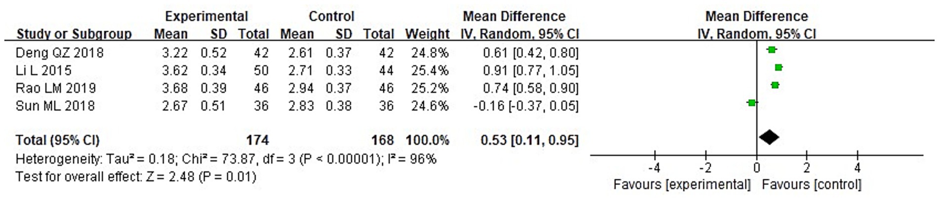 Forest plot showing the mean differences between experimental and control groups across four studies. Each study displays mean, standard deviation, total participants, and weight. Mean differences and confidence intervals (CI) are provided: Deng QZ 2018 (0.61 [0.42, 0.80]), Li L 2015 (0.91 [0.77, 1.05]), Rao LM 2019 (0.74 [0.58, 0.90]), and Sun ML 2018 (-0.16 [-0.37, 0.05]). The overall mean difference is 0.53 [0.11, 0.95]. Heterogeneity: Tau² = 0.18, Chi² = 73.87, df = 3, p < 0.00001, I² = 96%. Overall effect Z = 2.48, p = 0.01.