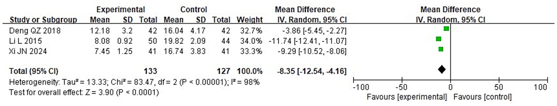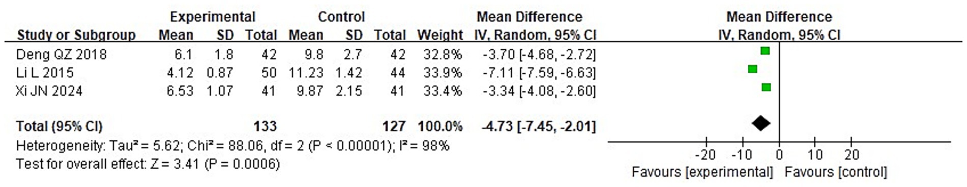 Forest plot showing three studies comparing experimental and control groups with mean differences and confidence intervals. Studies include Deng QZ 2018, Li L 2015, and Xi JN 2024. Combined mean difference is -4.73 with a confidence interval of -7.45 to -2.01. The plot indicates a significant overall effect favoring the experimental group. Heterogeneity is high with I² at ninety-eight percent.