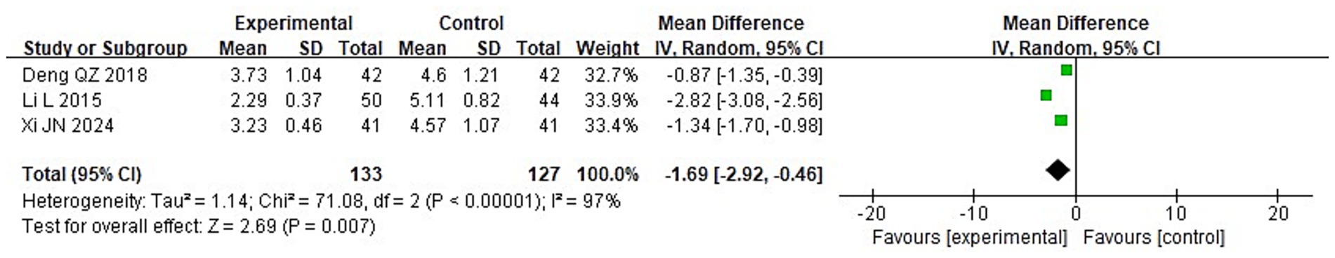 Forest plot showing mean differences between experimental and control groups across three studies: Deng QZ 2018, Li L 2015, and Xi JN 2024. Each study's weight and confidence interval are displayed. The total mean difference is -1.69 with a 95% confidence interval from -2.92 to -0.46. Heterogeneity analysis indicates significant variability (I² = 97%). Overall effect test is significant (Z = 2.69, P = 0.007). The plot visually represents these differences with squares and a diamond indicating the overall effect.