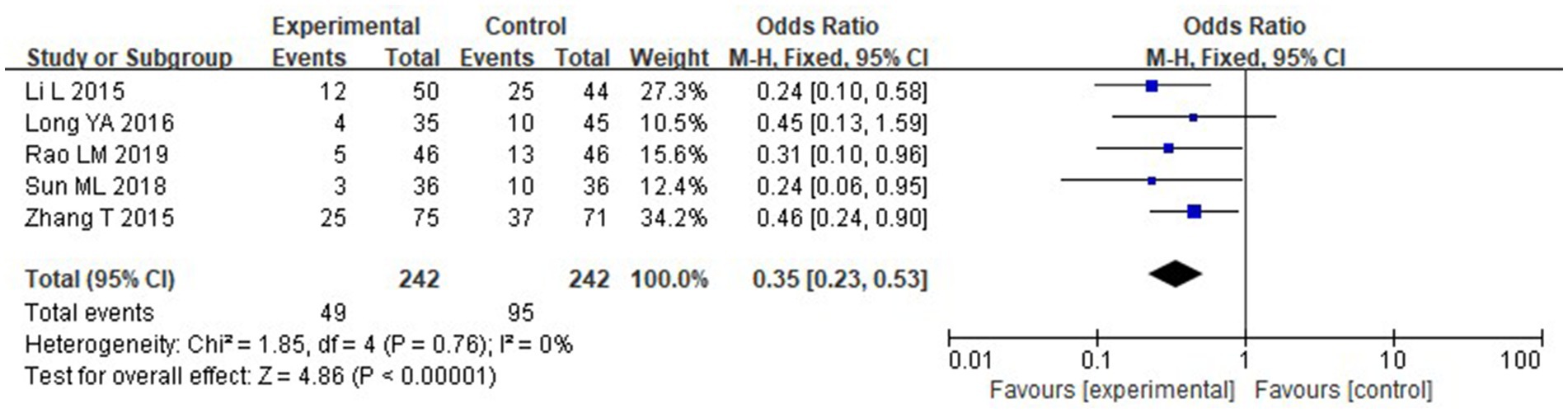 Forest plot showing odds ratios and confidence intervals for five studies comparing experimental and control groups. Li L 2015 has an odds ratio of 0.24; Long YA 2016, 0.45; Rao LM 2019, 0.31; Sun ML 2018, 0.24; Zhang T 2015, 0.46. The overall odds ratio is 0.35 with a 95% confidence interval of 0.23 to 0.53. Test for overall effect shows Z = 4.86 with P < 0.00001. Heterogeneity is low with I squared = 0%.