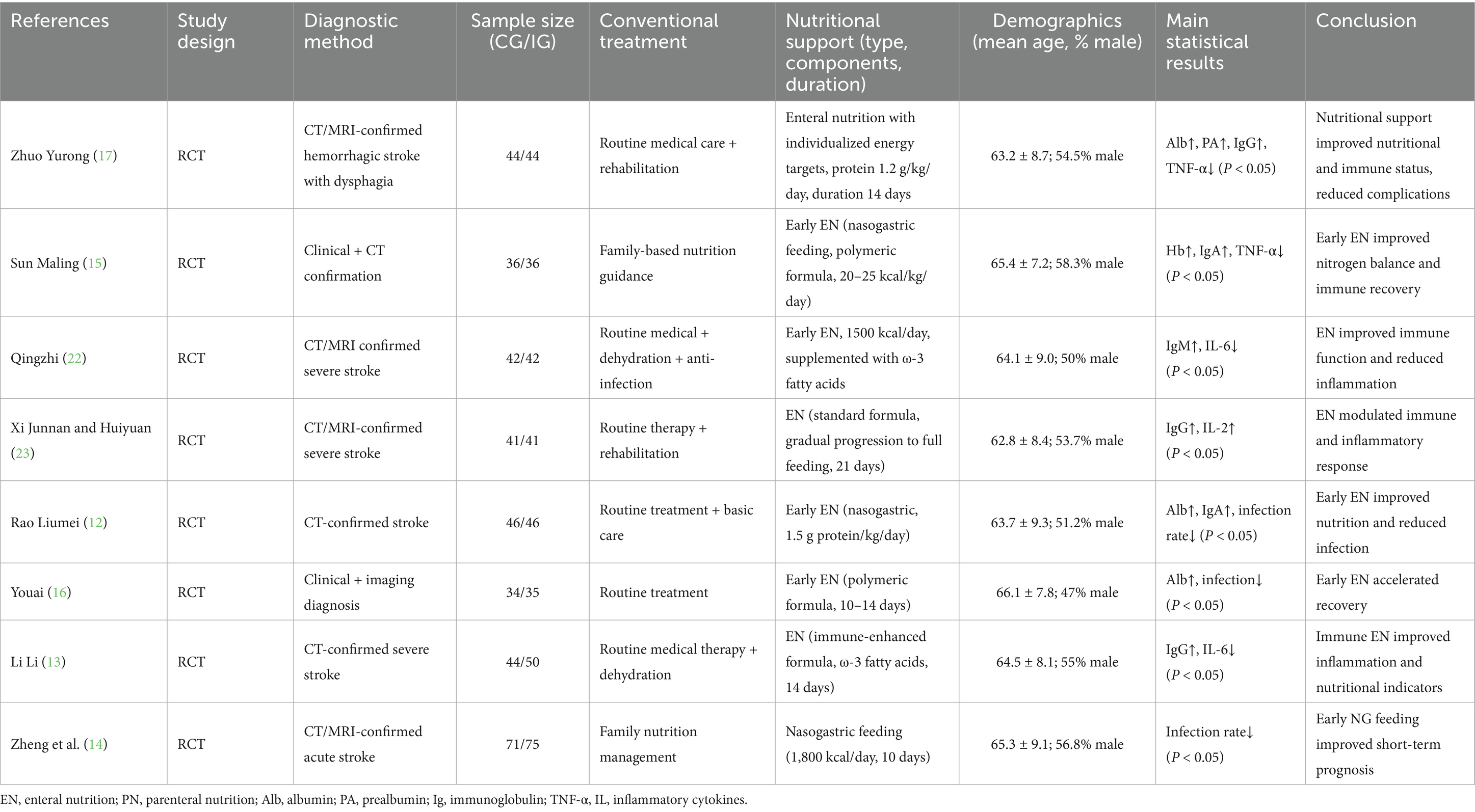 Stroke is a neurological disorder resulting from cerebrovascular injury and subsequent brain tissue necrosis, characterized by high incidence and mortality (18). In severe cases, rapid disease progression, impaired consciousness, motor dysfunction, and gastrointestinal dysmotility often lead to dysphagia and negative nitrogen balance (19, 20). The present meta-analysis synthesized data from eight randomized controlled trials evaluating nutritional support combined with conventional therapy in stroke patients. Consistent with prior reports, nutritional intervention significantly improved short-term nutritional and immune indicators (PA, Hb, TLC, IgA, IgG, IgM) and reduced inflammatory cytokines (IL-2, IL-6, TNF-α), thereby lowering infection risk. However, its effect on neurological function as measured by NIHSS was limited, suggesting that the primary benefits of nutritional support occur during early metabolic stabilization rather than direct neurofunctional recovery.