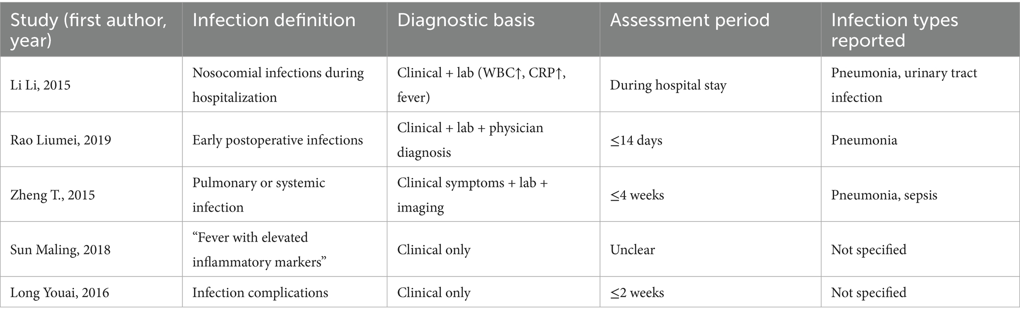To improve transparency, a summary of infection assessment definitions across included studies is provided in Table 2.