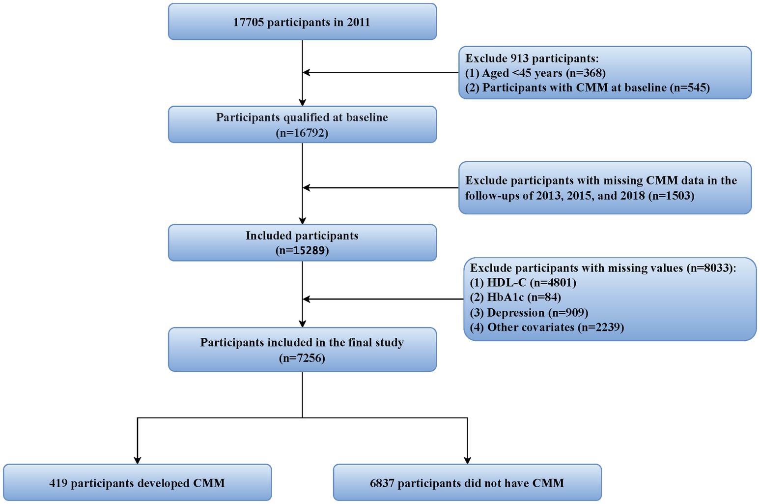 For this research, the 2011 CHARLS data was utilized as baseline data, with follow-ups conducted in 2013, 2015, and 2018 to assess study outcomes. To ensure data integrity and research rigor, the following exclusion criteria were established: (1) participants younger than 45 years; (2) individuals with missing CMM data or already diagnosed with CMM during the 2011 baseline survey; (3) participants with missing data on HbA1c, HDL-C, or any covariates included at baseline; and (4) individuals with missing CMM data during follow-ups in 2013, 2015, or 2018. Ultimately, 7,256 participants who met the study criteria were included, with the specific inclusion and exclusion processes detailed in Figure 1.