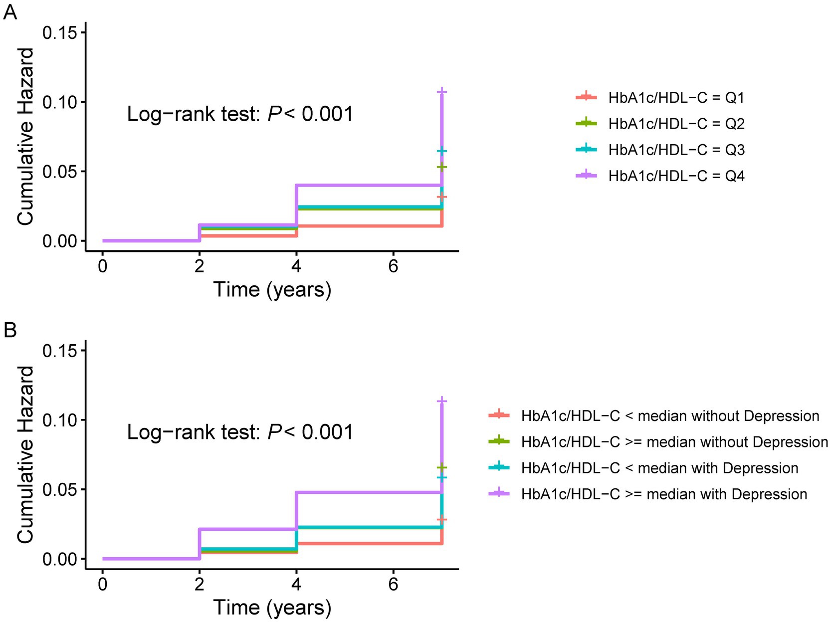 Figure 2. K-M plot of CMM by depression and HbA1c/HDL-C ratio levels. (A) K–M plot of CMM by HbA1c/HDL-C ratio levels. (B) K-M plot of CMM by the joint effect of HbA1c/HDL-C ratio and depression. CMM, cardiometabolic multimorbidity; HDL-C, high-density lipoprotein cholesterol; HbA1c, hemoglobin A1c.