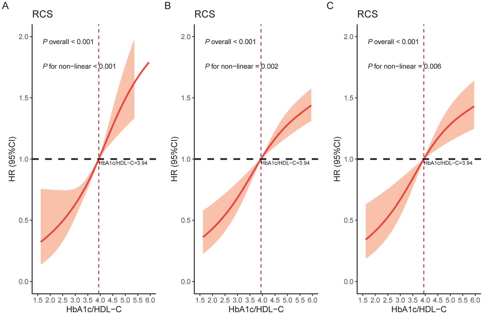 Figure 3. Restricted cubic spline of the association between the HbA1c/HDL-C ratio and the risk of CMM. (A) Crude model; (B) Adjusted for age, gender, education, location, marital, BMI, WC, smoking, drinking, SBP, DBP, and sleep duration; (C) Further adjusted for hypertension, kidney disease, antidiabetic, antidyslipidemic, LDL-C, TC, TG, creatinine, UA, and CRP. HbA1c, hemoglobin A1c; HDL-C, high-density lipoprotein cholesterol; CMM, cardiometabolic multimorbidity; CI, confidence interval; HR, hazard ratio; BMI, body mass index; WC, waist circumference; SBP, systolic blood pressure; DBP, diastolic blood pressure; LDL-C, low-density lipoprotein cholesterol; TC, total cholesterol; TG, triglyceride; UA, uric acid; CRP, C-reactive protein.