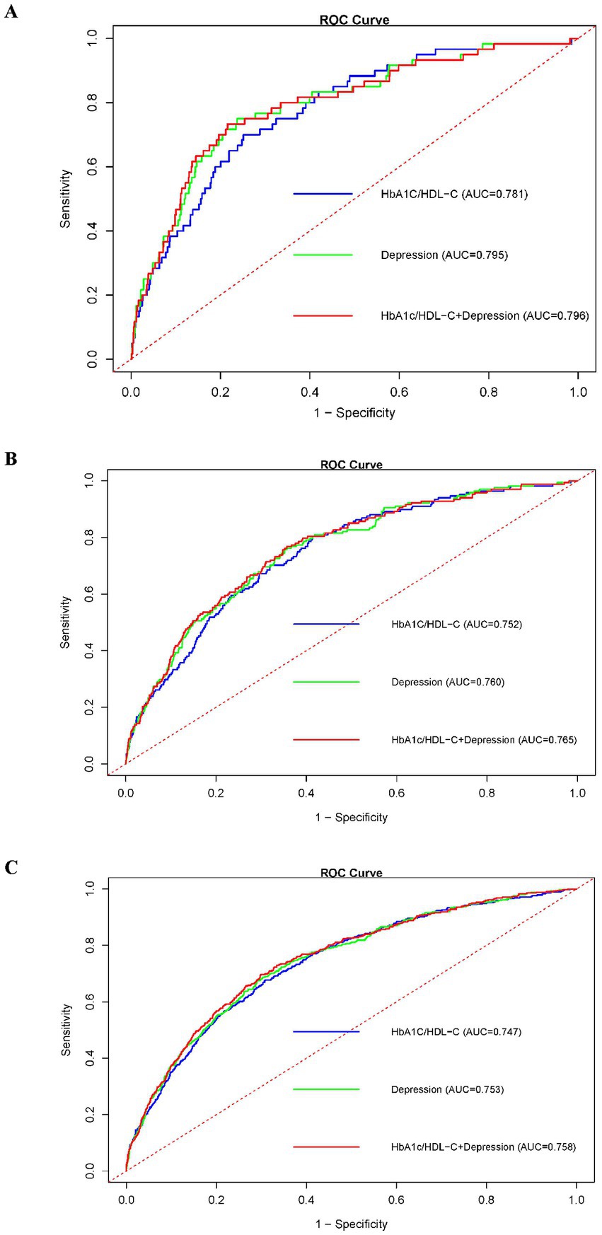 Figure 4. ROC curves comparing the predictive efficacy of the HbA1c/HDL-C ratio, depression, and their joint effect on CMM at different follow-up years. (A) ROC curves for prediction in 2013; (B) ROC curves for prediction in 2015; (C) ROC curves for prediction in 2018. Abbreviations: ROC, receiver operating characteristic; HDL-C, high-density lipoprotein cholesterol; HbA1c, hemoglobin A1c; CMM, cardiometabolic multimorbidity.