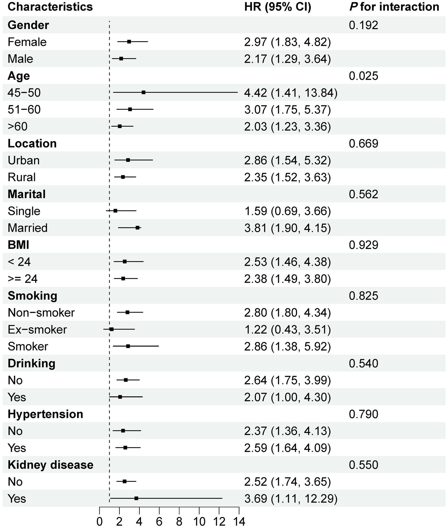 Supplementary Figure S1 shows the forest plot of subgroup and interaction analyses for the association between HbA1c/HDL-C ratio and CMM risk. A significant interaction was observed only for age (P for interaction <0.05), with the association remaining positive across all age subgroups. In most other subgroups, the association was also generally positive. Figure 5 illustrates similar analyses for the joint effect of higher HbA1c/HDL-C ratio and depression. Again, age was the only significant effect modifier, while the combined effect remained significant across most subgroups, except among single participants and former smokers. Sensitivity analyses further supported the robustness of our findings. First, excluding participants with pre-existing heart disease, stroke, or diabetes at baseline yielded results consistent with the primary analysis (Supplementary Table S8). Second, excluding individuals who developed CMM during the 2013 or 2015 follow-ups also produced similar results (Supplementary Table S9). Finally, using MICE to handle missing data, rather than simple deletion, did not materially alter the findings (Supplementary Table S10).