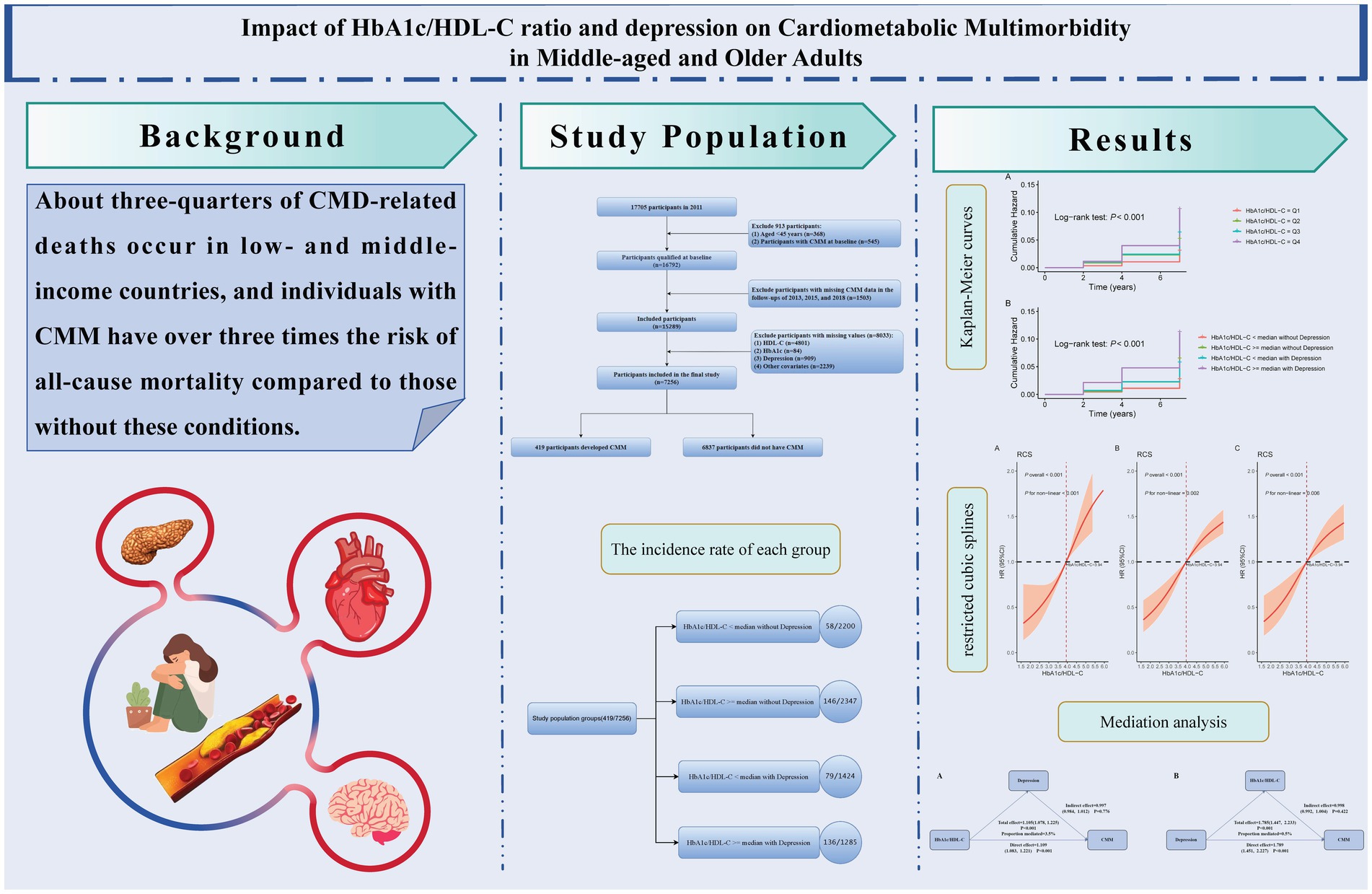 Glucose-lipid metabolic disorders and depression have both been independently associated with an increased risk of CMM. Emerging evidence also suggests a potential bidirectional relationship between these two conditions (23), and their coexistence may exert synergistic or additive effects on CMM risk. However, few studies have systematically examined the association between the HbA1c/HDL-C ratio and CMM risk, particularly regarding its joint effect with depressive symptoms. Given the heightened vulnerability of middle-aged and older adults to both metabolic dysfunction and psychological distress, this study uses data from the China Health and Retirement Longitudinal Study (CHARLS) to investigate the independent effect of the HbA1c/HDL-C ratio and its joint effect with depression on CMM risk. The findings are expected to enhance understanding of how metabolic and psychological factors jointly contribute to CMM development and to inform early identification and targeted interventions for high-risk populations.
