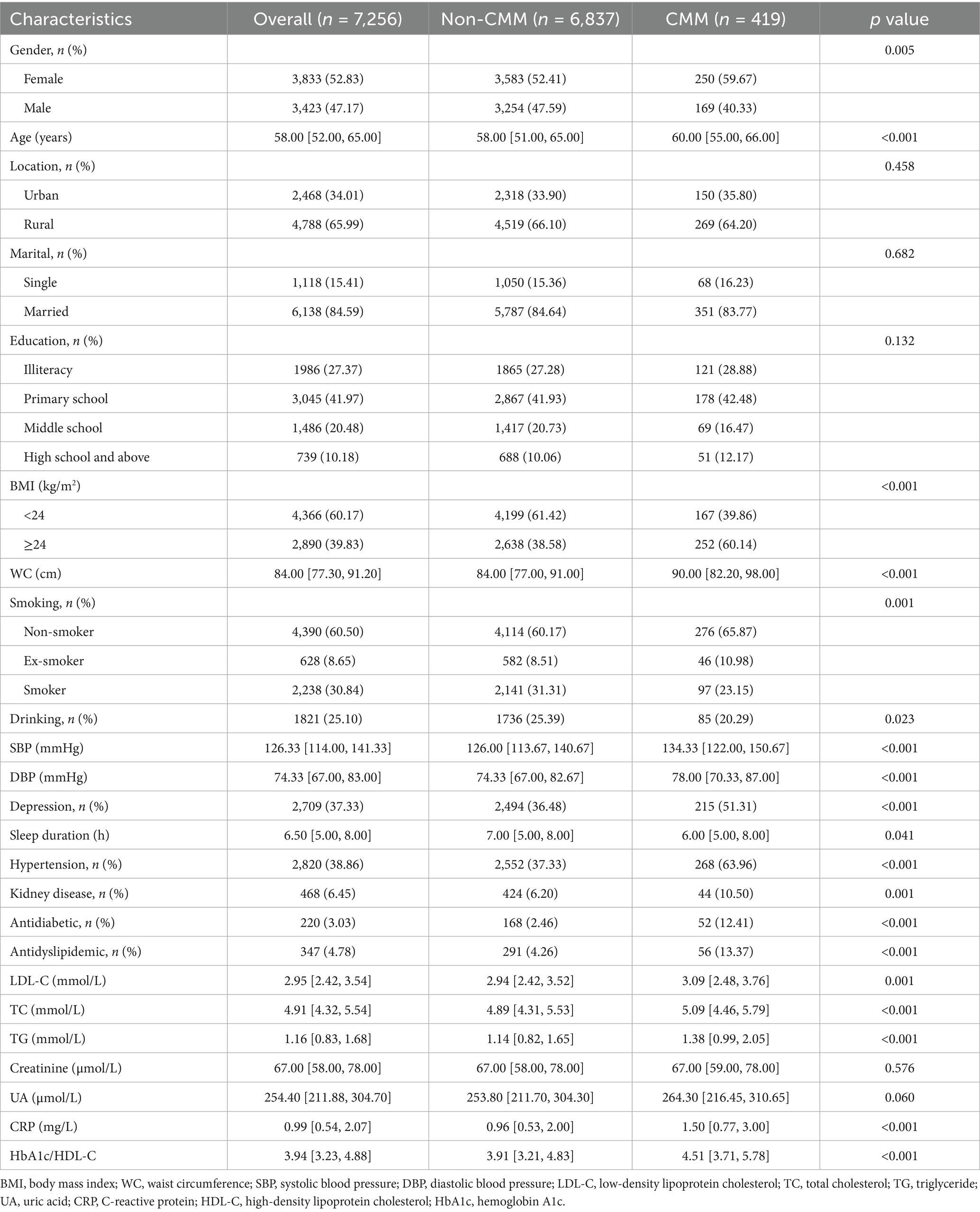 Taking into account the proportion of missing values and the results of the GVIF assessment, a total of 22 covariates were ultimately included in the final analysis (Supplementary Tables S2, S3). A total of 7,256 participants from the 2011 to 2018 waves of the CHARLS were included in this study. The mean age was 58 years, 52.83% were female, and 65.99% resided in rural areas. During the 7-year follow-up period, 419 incident cases of CMM were identified, corresponding to an incidence proportion of 5.77%. Compared with participants without CMM, those with CMM were older, more often female, had higher BMI and WC, were more likely to have depression and hypertension, and exhibited higher use of antidiabetic and antidyslipidemic medications as well as elevated lipid and inflammatory markers (Table 1). Stratification by HbA1c/HDL-C quartiles showed that higher ratios were associated with male sex, urban residence, higher BMI, smoking, hypertension, and increased use of metabolic medications (Supplementary Table S4). Participants with depression were more likely to be female, older, rural residents, single, and have lower educational attainment and HbA1c/HDL-C ratios (Supplementary Table S5).