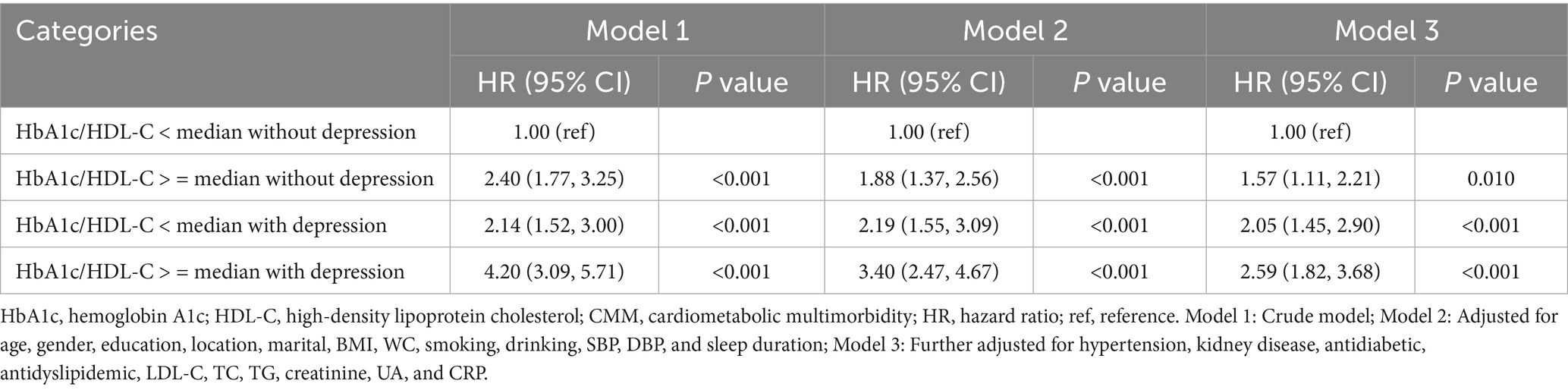 A prospective cohort study of 6,663 participants also found that more frequent depression significantly increased the risk of incident CMM, with a 73% increase in risk for every 9-point rise in CES-D-10 score (42). A large-scale meta-analysis also showed that individuals with severe mental disorders had a 53% higher prevalence of CVD, a 78% higher incidence, and an 85% higher risk of CVD-related mortality compared to the general population (43). In our study, Individuals with both a high HbA1c/HDL-C ratio and depressive symptoms had a higher CMM risk than those with either factor alone. The non-significant interaction term (p > 0.05) suggests their effects are more likely additive rather than multiplicative. Furthermore, mediation analysis indicated that depression did not mediate the association between the HbA1c/HDL-C ratio and CMM, implying that these factors may influence CMM through independent pathways.
