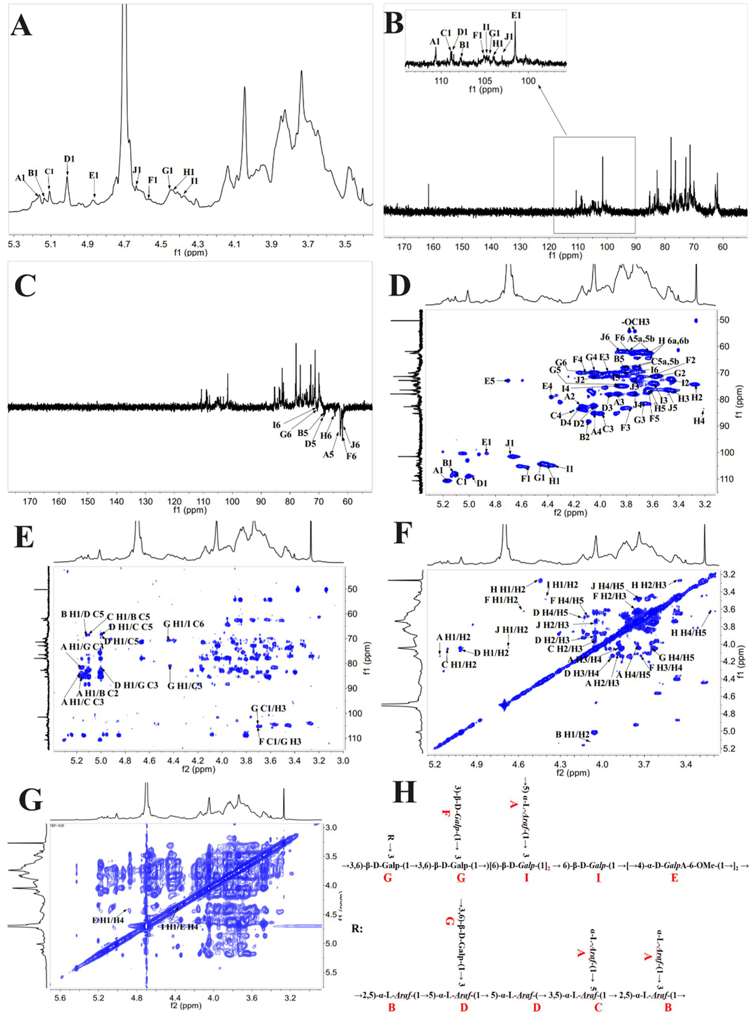 NMR spectra and the suggested structure of BDP-I. (A)1H NMR; (B)13C HMR; (C) DEPT 135; (D)1H-1H COSY; (E) HSQC; (F) NOESY; (G) HMBC and (H) suggested structure of BDP-I.