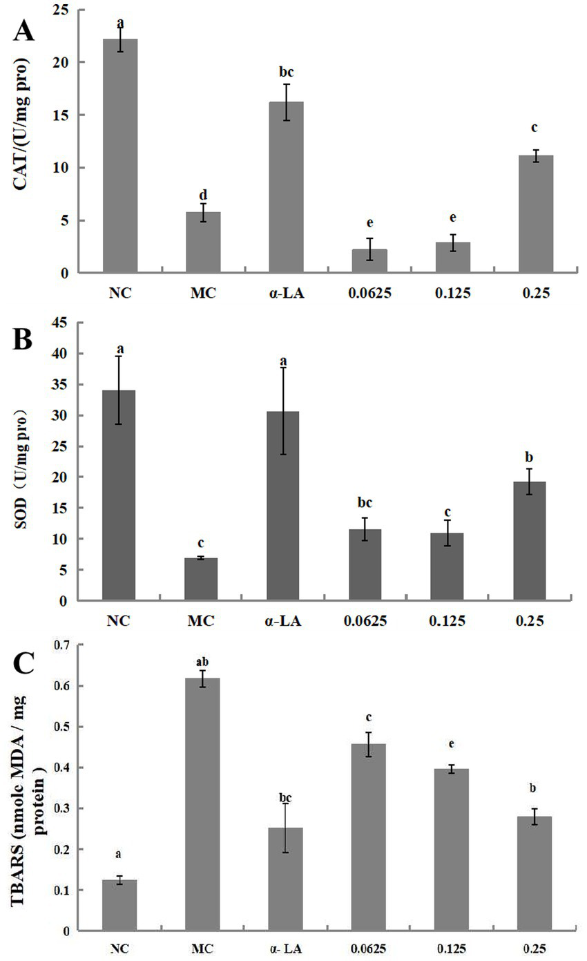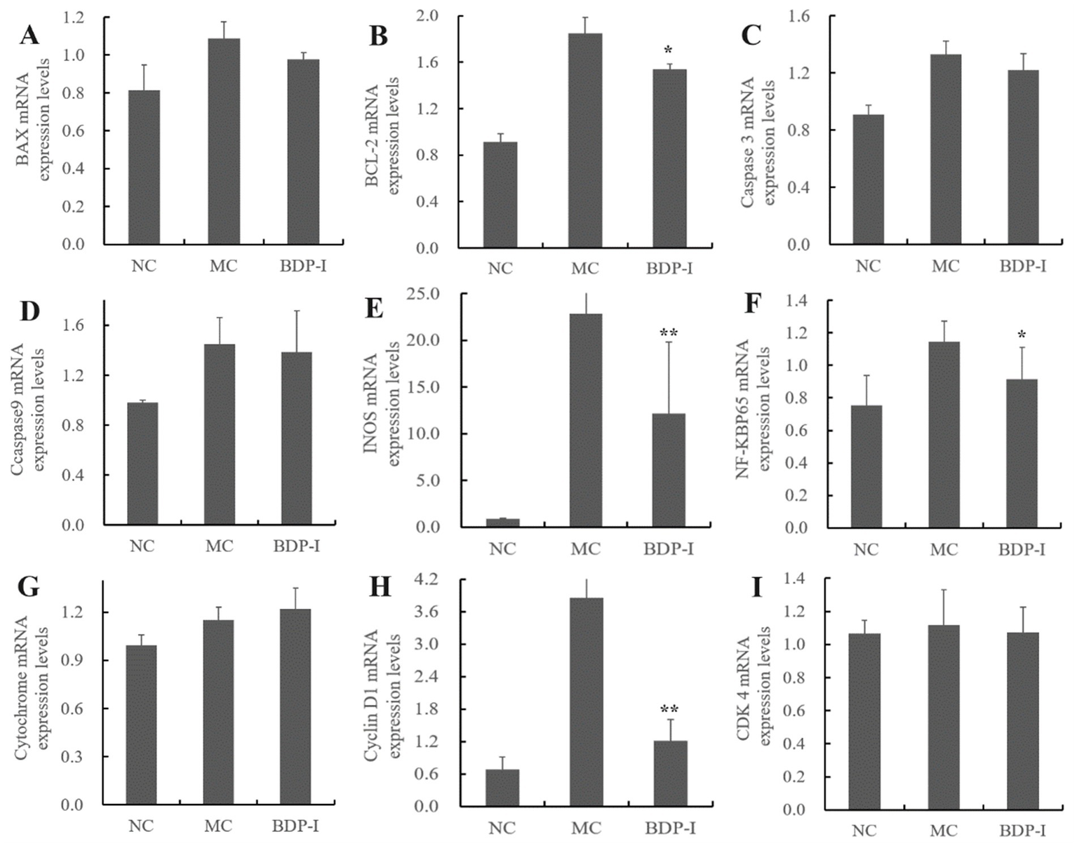 Based on the results of cell survival, the following groups could be identified: the NC, where RPMI-1640 medium containing 10% fetal bovine serum was used, the positive control group (PC) treated with 300 μmol/L of α-LA, the model group (MC) treated with 250 μmol/L of H2O2 as well as the BDP-I-treated groups which could be further subdivided into the BDP-I low-dose group (0.0625 mg/mL), BDP-I medium-dose group (0.125 mg/mL) and BDP-I high-dose group (0.25 mg/mL).