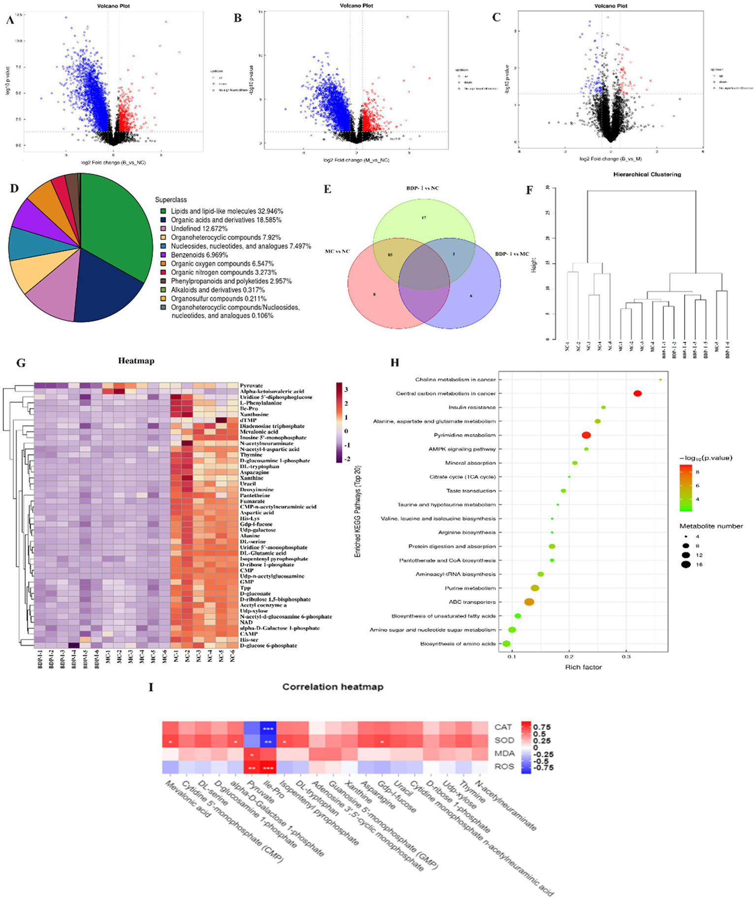 One-way analysis of variance (ANOVA) was performed to compare multiple groups to determine whether the NC differed from the BDP-I-treated group. The quality of the normalized data was also assessed before multivariate statistical analysis, which included principal component analysis (PCA) and orthogonal partial least squares discriminant analysis (OPLS-DA). In the latter case, the variable importance values (VIP > 1, SPSS significance analysis p < 0.05) were used to screen for differential metabolites between groups. The m/z values of the compounds were also entered into the HMDB database for metabolite screening, with the HMDB ID of any significant differential metabolites subsequently entered into the MetaboAnalyst database for further validation as well as for bioinformatics analysis, which included clustering analysis, correlation analysis, pathway analysis, amongst others.