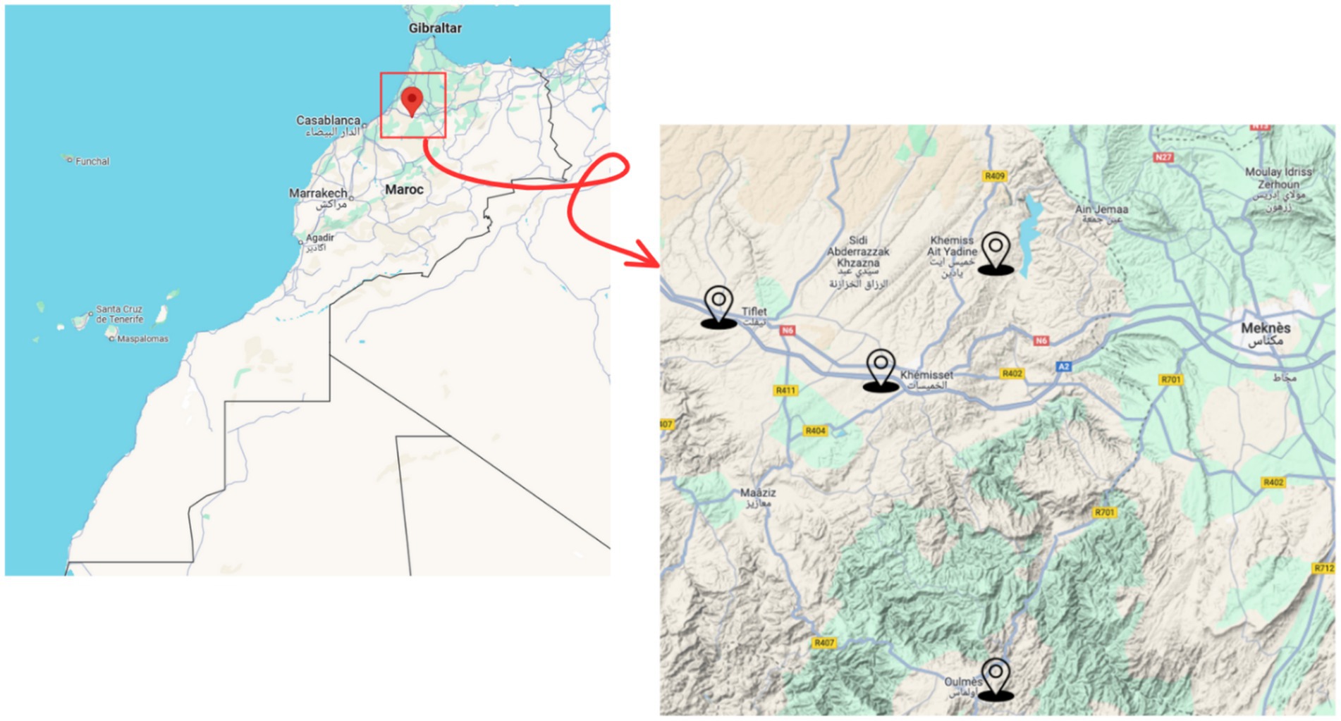 This research constitutes a prospective cross-sectional survey that was carried out among schoolchildren in the Aït Yadine region, which is located in the province of Khemisset in Morocco, between early January and May 2025 (Figure 1). The study population comprises a total of 325 schoolchildren from both urban and rural areas, reflecting diverse socioeconomic conditions and lifestyle patterns. Schools were sampled using a stratified random approach, and children were selected from class lists according to predefined inclusion/exclusion criteria; all participants were enrolled after parental informed consent. Khemisset is distinguished by its heterogeneity in terms of income levels, educational attainment, and access to fundamental services and offers a pertinent context for the examination of population-level health and developmental indicators. While the study sample was limited to primary school students, the demographic characteristics of the participants (age, gender distribution, and socioeconomic status) are broadly consistent with those reported in national statistics for rural Moroccan schoolchildren. However, given the regional focus, the findings may not be fully generalizable to all Moroccan children, particularly those in urban areas.