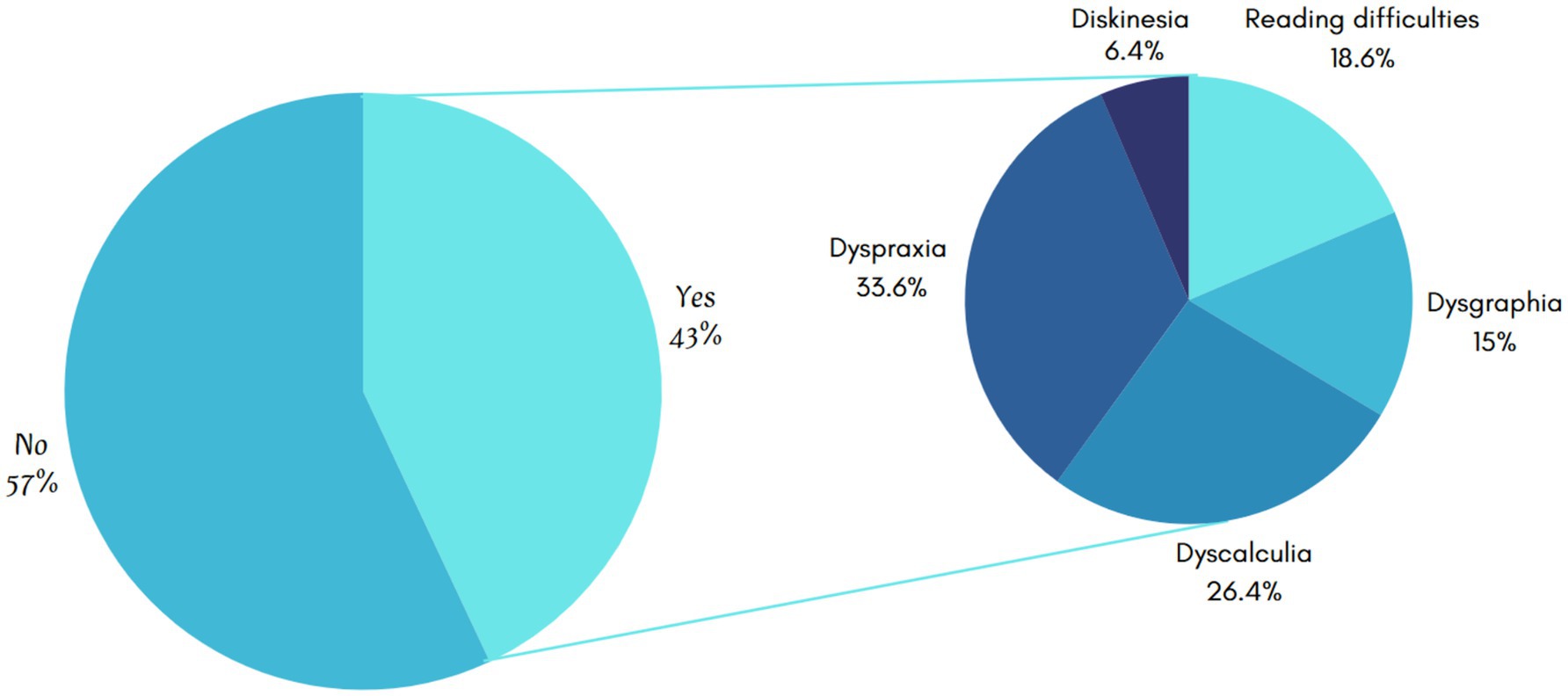 Among students with learning difficulties (Figure 2), dyspraxia was the most commonly reported issue. Dyspraxia, a developmental coordination disorder, has been shown to interfere with motor skills and academic performance, particularly in tasks requiring fine motor control, such as writing (41, 42). Dyscalculia was the second most prevalent condition. Dyscalculia, a condition characterized by difficulties with numerical concepts and arithmetic, is increasingly recognized for its impact on students’ academic progression and self-esteem (43).
