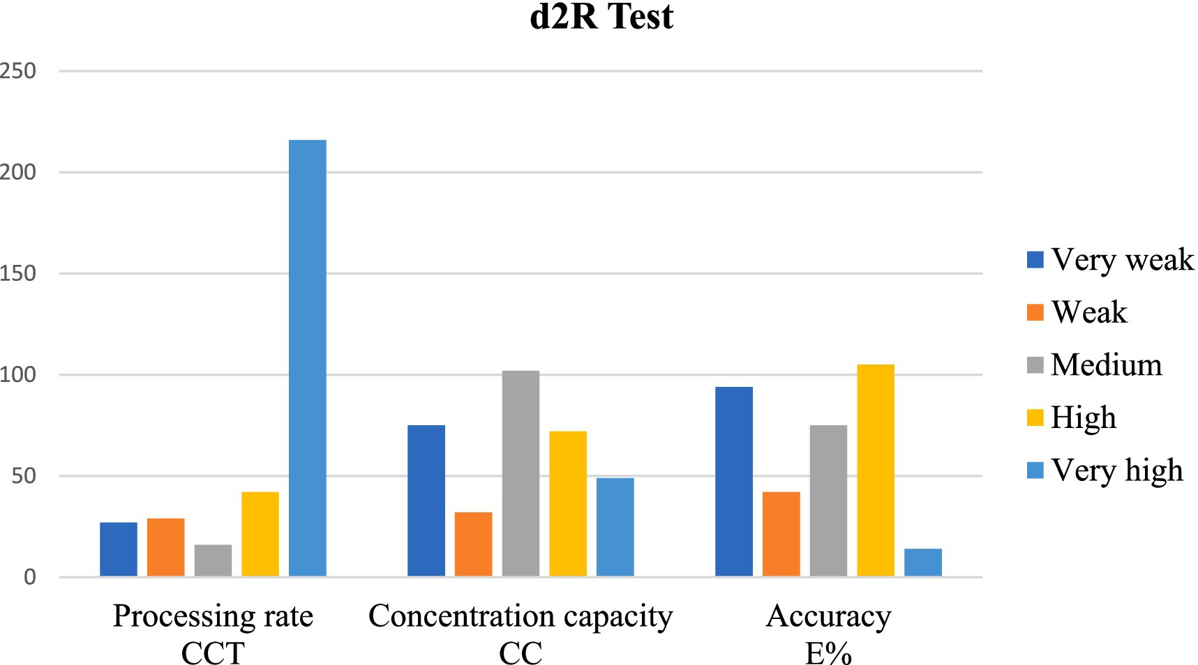 The results of the d2R test demonstrated significant variability. While processing speed (CCT) was largely categorized as “very high,” concentration capacity (CC) and accuracy (E%) were more heterogeneous. This finding indicates that high processing rates do not necessarily equate to better attentional quality or precision.