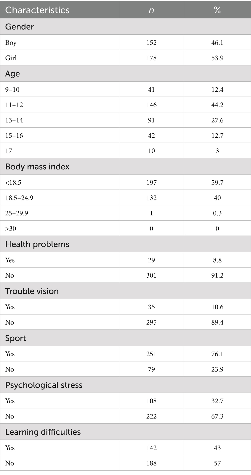 The study sample consisted of 330 primary school students, with a slightly greater proportion of girls than boys (Table 1). The majority of participants were aged between 11 and 12 years, followed by those aged between 13 and 14 years, whereas students aged between 9 and 10 years and those aged between 15 and 17 years represented smaller fractions. Regarding the nutritional status of the students, 59.7% of the participants were classified as undernourished on the basis of BMI-for-age Z-scores, with Z-scores below −2 standard deviations (SDs) from the median. Approximately 40% of the children fell within the normal nutritional range (Z-scores between −2 and +1 SD), whereas only 0.3% were identified as overweight (Z-scores > + 1 SD). No cases of obesity (Z-scores > + 2 SD) were observed. Nevertheless, undernutrition remains a significant problem in low- and middle-income countries, where socioeconomic disparities frequently result in insufficient dietary intake (35, 36).