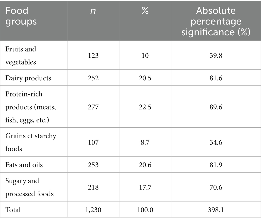 Furthermore, the study aimed to ascertain the level of engagement of the participants in regular physical activity. The second section focused on dietary habits, assessing the number of meals consumed per day (including breakfast), breakfast consumption, the frequency and timing of snacking (between breakfast and lunch or between lunch and dinner), and the primary food groups commonly consumed (e.g., fruits and vegetables, dairy products, protein-rich foods, grains, fats, and processed foods). The classification of food categories was based on the Moroccan National Nutrition Strategy guidelines (31) (or FAO/WHO food-based dietary guidelines), which methodically categorizes foods into major groups. The grouping of food items was based on their nutritional characteristics and consumption patterns, using the NOVA classification framework (32). The NOVA classification system categorizes foods according to the extent and purpose of processing. Alternatively, in the event that the grouping was in accordance with a national or WHO dietary guideline, this should be specified.