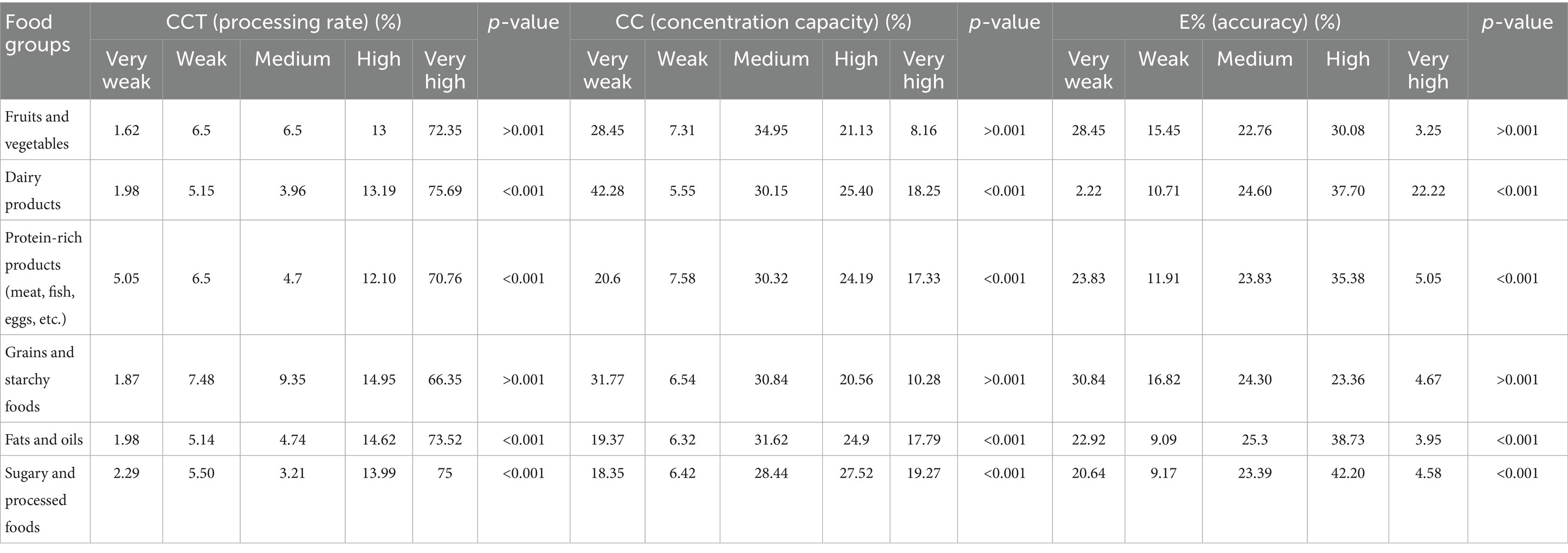 Cognitive performance is affected by dietary patterns, with macronutrient composition playing a critical role in information processing, attention, and accuracy. The present study evaluated the impact of different food groups on cognitive function using three parameters: processing rate (CCT %), concentration capacity (CC %), and accuracy (E %) (Table 4). The findings revealed statistically significant differences among the food groups (p < 0.001), except for two food groups: fruits and vegetables and grains and starchy foods, underscoring the varied contributions of macronutrients to cognitive efficiency.