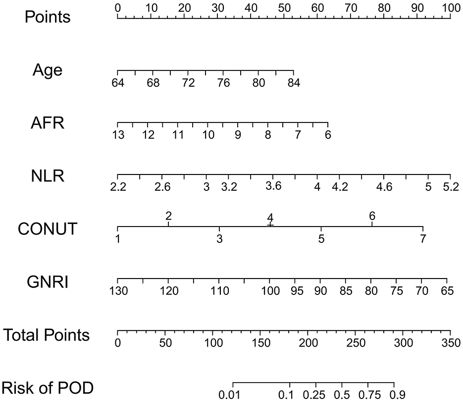 Results: The POD incidence reached 16.2% (n = 41) during the 7-day postoperative surveillance. Multivariable analysis delineated five independent predictors: advanced age (OR = 1.12, P = 0.031), depressed albumin-fibrinogen ratio (AFR; OR = 0.69, P = 0.029), elevated neutrophil-lymphocyte ratio (NLR; OR = 3.51, P = 0.001), Controlling Nutritional Status (CONUT) score (OR = 1.81, P = 0.003), and Geriatric Nutritional Risk Index (GNRI; OR = 0.94, P = 0.001). The constructed nomogram exhibited robust discriminative capacity, achieving area under curve (AUC) values of 0.821 and 0.966 in internal and external validations, respectively.