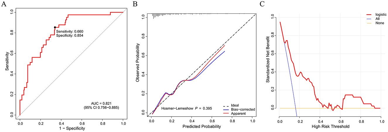 Figure 3. External validation of the nomogram model by ROC curve (A), calibration (B), and decision curve analysis (C). ROC, receiver operating characteristic; AUC, area under the curve.