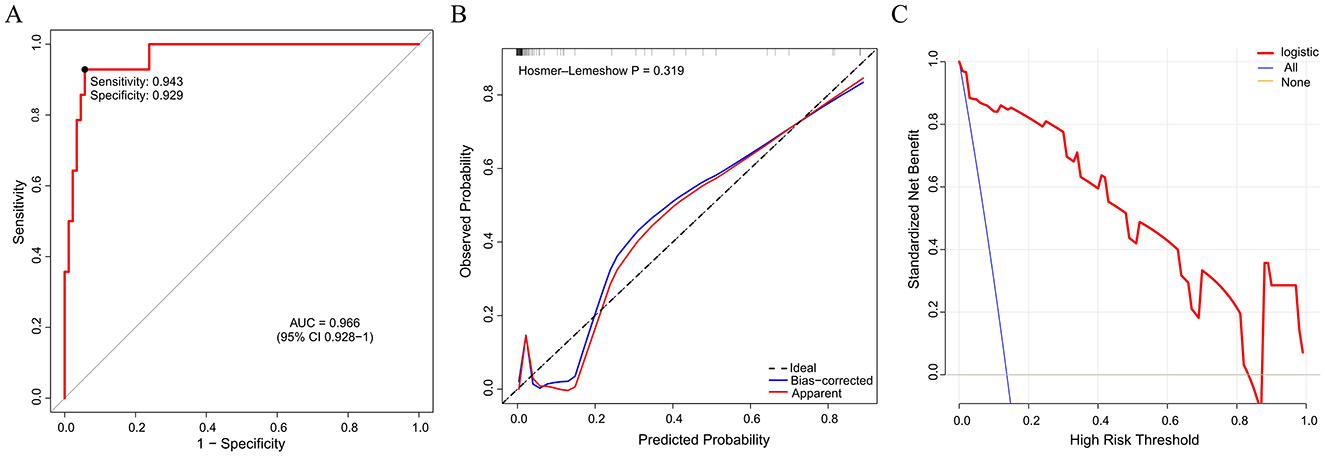Figure 2. Nomogram model evaluation by ROC curve (A), calibration (B), and decision curve analysis (C). ROC, receiver operating characteristic; AUC, area under the curve.