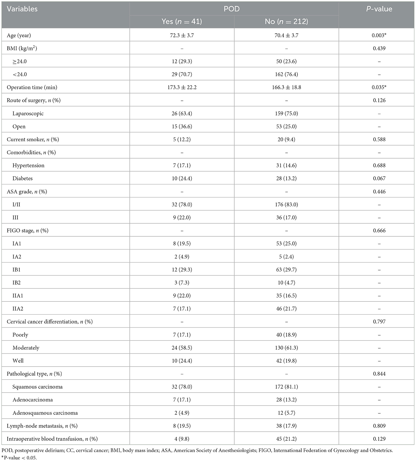 Cervical cancer (CC) ranks as the fourth most common cancer and the fourth leading cause of cancer-related deaths among women worldwide (1). With the widespread adoption of CC screening technologies and human papillomavirus (HPV) vaccination, the incidence of CC has been declining annually in many developed countries (2). However, studies indicate that cancer incidence among the elderly population is 11 times higher than in other age groups (3). In 2022, China reported 150,700 new CC cases and nearly 60,000 deaths, with elderly women (aged over 60) accounting for 29.8% of cases. Elderly patients often present with later-stage diagnoses due to reluctance to seek medical care, fear of gynecological exams, and poorer overall health with multiple comorbidities, leading to worse prognoses (4). Based on the International Federation of Gynecology and Obstetrics (FIGO) guideline, radical hysterectomy with pelvic lymph node dissection is the primary curative treatment for early-stage CC (5), though minimally invasive approaches remain controversial. As a frequent complication in elderly surgical patients, postoperative delirium (POD) is associated with prolonged recovery, cognitive decline, and increased mortality (6). Recent studies have suggested that the development of POD is influenced by multiple factors, including age, comorbidities, and surgical stress (7, 8). One of the key mechanisms underlying POD may involve inflammation, which is triggered by both the surgical trauma and underlying cancer-related factors (9). Systemic inflammatory responses, characterized by the release of pro-inflammatory cytokines (such as IL-6, TNF-α), have been shown to contribute to neuroinflammation and affect brain function, leading to cognitive dysfunction post-surgery (10). This inflammatory response may also worsen the prognosis of elderly patients with cancer (11). Additionally, oxidative stress and blood-brain barrier disruption are other proposed mechanisms by which inflammation may induce or exacerbate POD in these patients (12).