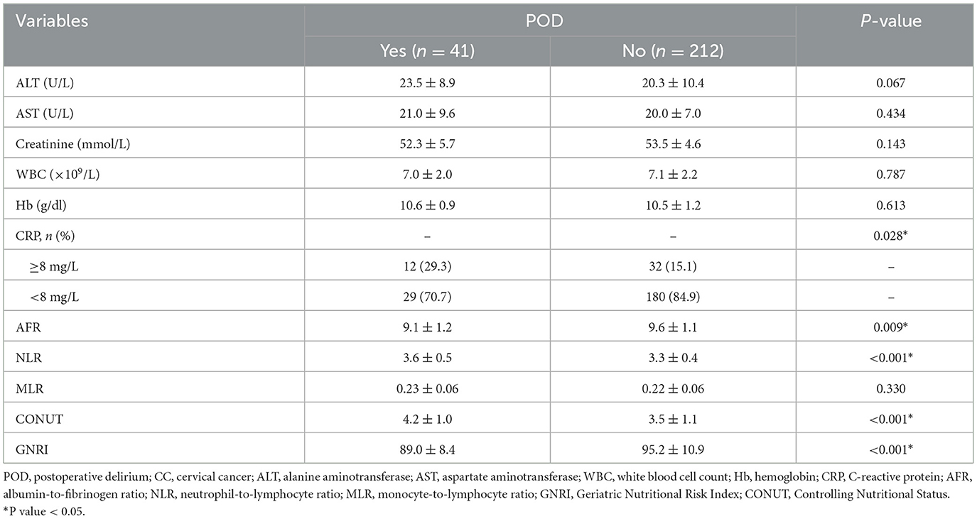 A total of 253 patients were analyzed for the occurrence of postoperative delirium (POD) following surgery for CC, with 41 patients diagnosed with POD within postoperative 7 days (16.2%). Table 1 summarizes associations between clinical variables and POD. Patients who developed POD were notably older (P = 0.003) and had longer surgical durations (P = 0.035) compared to those without POD. No significant differences were observed for BMI, surgical approach, smoking status, hypertension, diabetes, ASA grade, FIGO stage, CC differentiation, pathological types, lymph node metastasis, or intraoperative blood transfusion (P > 0.05). Some laboratory parameters were also compared between the POD group and the non-POD group (Table 2). Significant differences were observed in CRP (P = 0.028), AFR (P = 0.009), NLR (P < 0.001), CONUT (P < 0.001), and GNRI (P < 0.001) between patients with or without POD. Other laboratory variables, including ALT, AST, creatinine, WBC, Hb, and MLR, showed no significant differences between the two groups (P > 0.05).