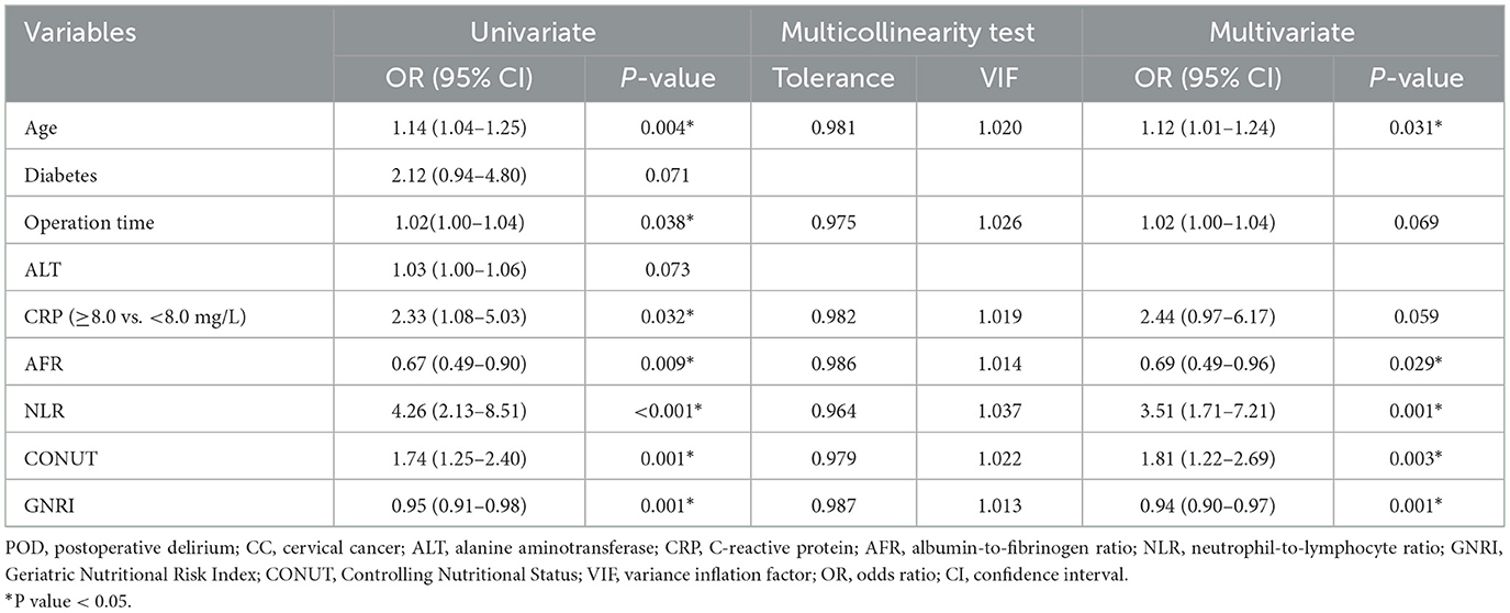 Table 3. Univariate, multivariate logistic regression analysis for POD in elderly CC patients, along with multicollinearity test.
