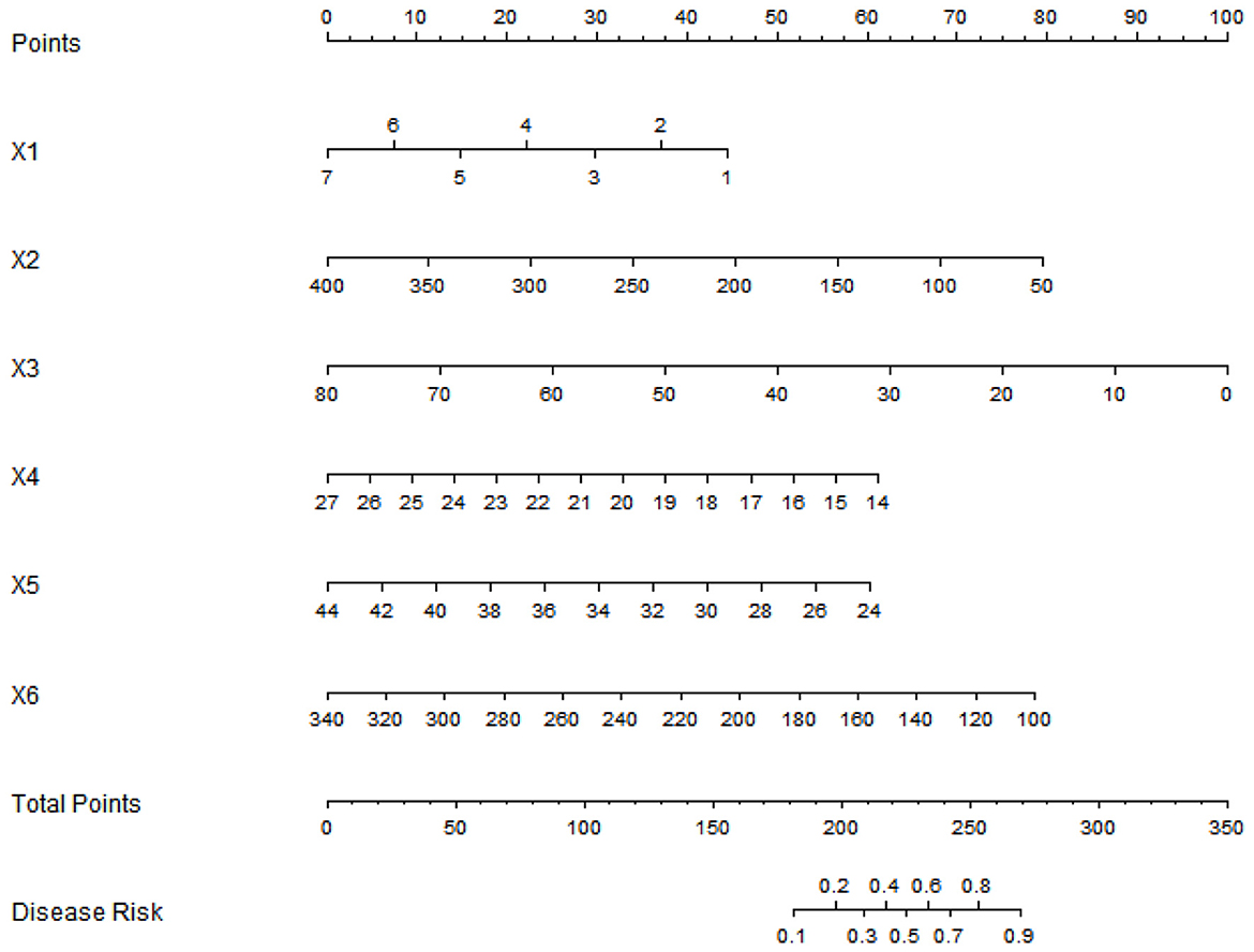 Figure 1. Nomogram of prognostic model for elderly postoperative patients (X1: Number of daily food types, X2: Cereal intake, X3: High-quality protein intake, X4: BMI, X5: Serum albumin, X6: Pre-albumin).